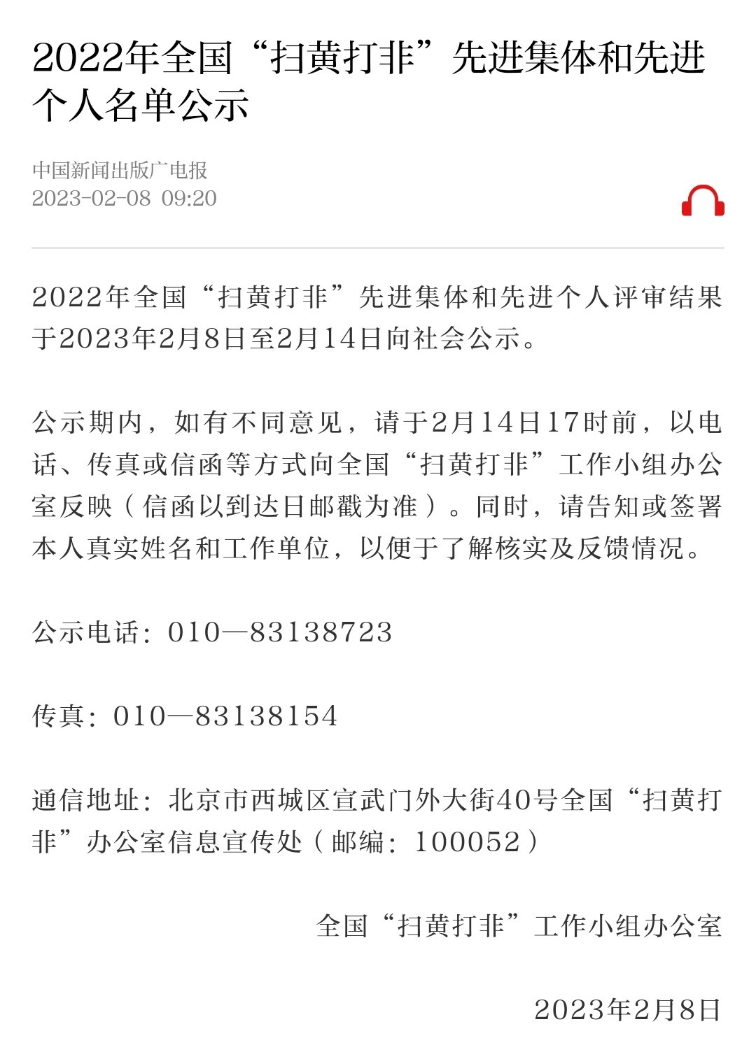 2月8日, 全国“扫黄打非”工作小组办公室公布了2022年全国“扫黄打非”先进集体和先进个人评审结果。