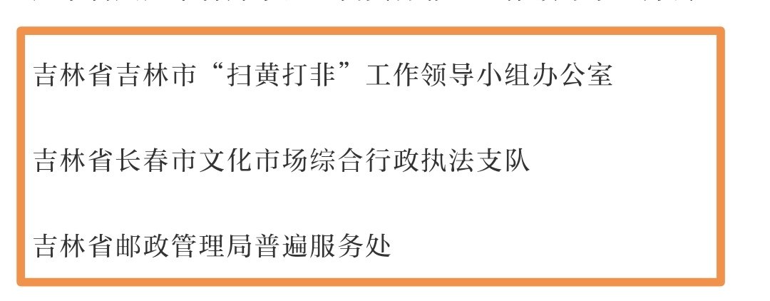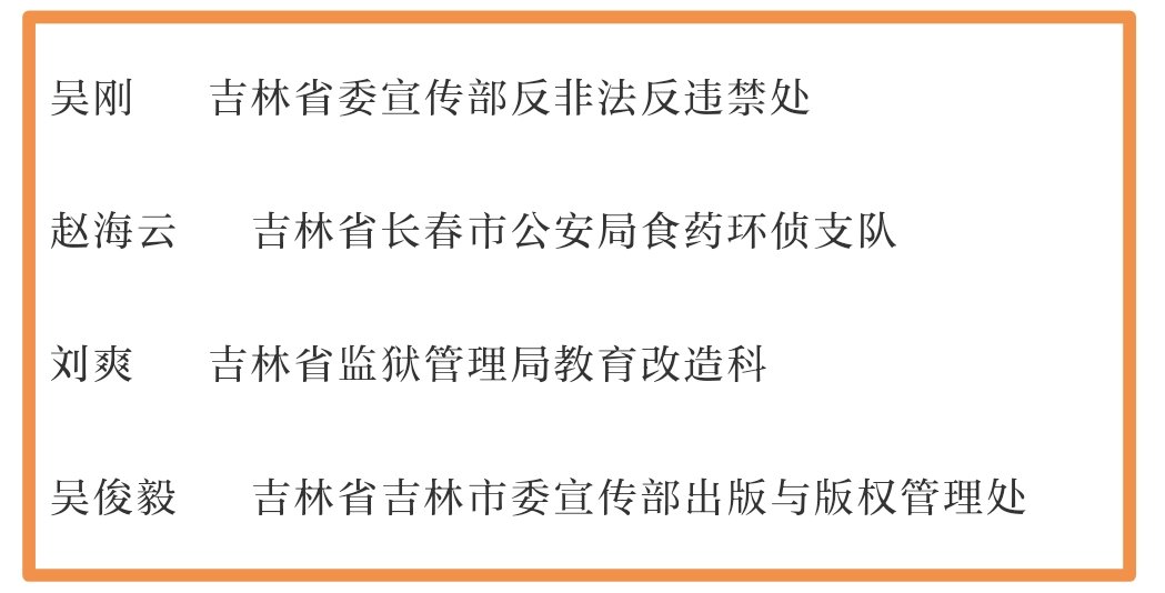 吉林省吉林市“扫黄打非”工作领导小组办公室、长春市文化市场综合行政执法支队、吉林省邮政管理局普遍服务处获评全国“扫黄打非”先进集体称号,吉林省委宣传部反非法反违禁处吴刚、吉林省长春市公安局食药环侦支队赵海云、吉林省监狱管理局教育改造科刘爽、吉林省吉林市委宣传部出版与版权管理处吴俊毅获评2022年全国“扫黄打非”先进个人称号。