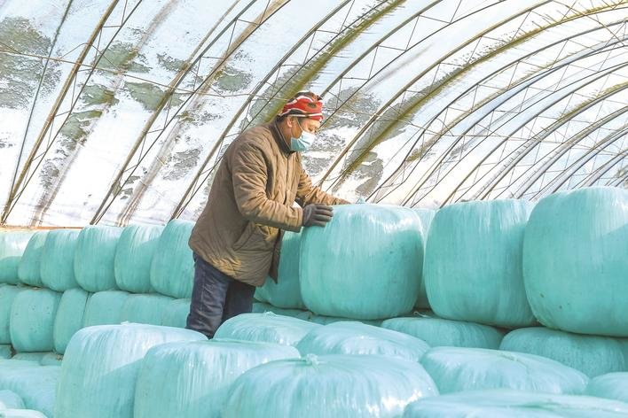 2月16日,在长春市九台区东湖街道腰站村,隆达兴养殖农民专业合作社农民整理玉米秸秆压缩包。 新华社记者 张楠 摄