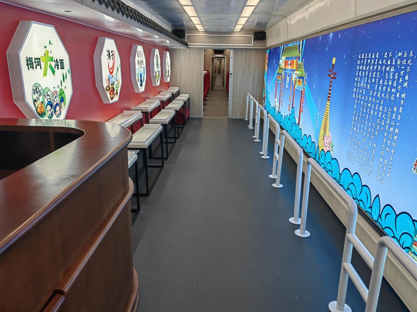 餐车配备四人位、双人位餐桌、啤酒吧台、点歌机、音响设备,为游客提供梅河特产美食和梅河精酿,满足乘客们的用餐需求。