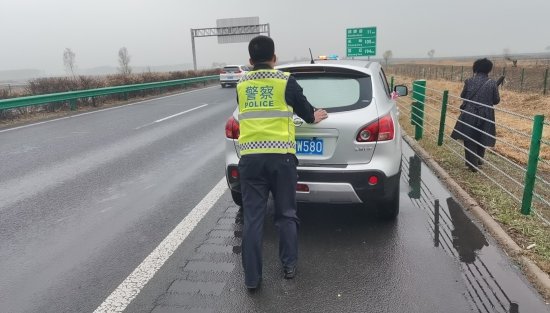 4月29日10时许,吉林高速公安松原分局巡逻五大队民警巡逻至大广高速公路双辽方向216公里处发现一辆小型越野车停在应急车道与行车道之间,车内乘客(七十多岁的老人和妇女)冒雨站在护网外,此时车流量较大,情况非常危险。