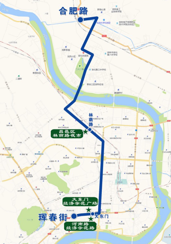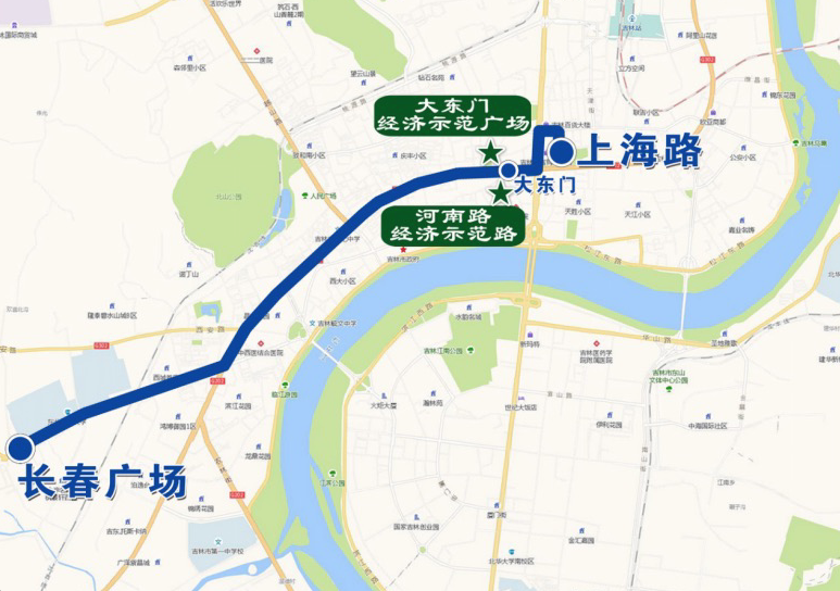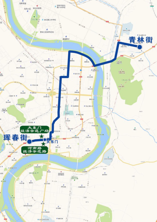 青林街始发,终到珲春街。途经大东门经济示范广场、河南路经济示范路。
