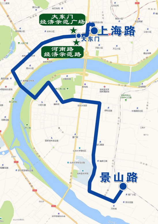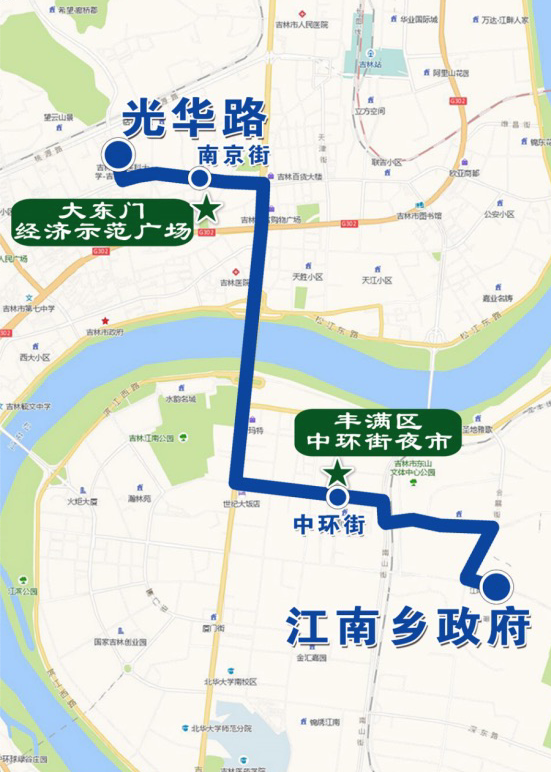 江南乡政府始发,终到光华路。途经丰满区中环街夜市、大东门经济示范广场。