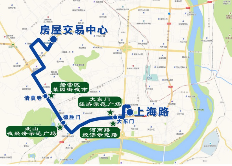 房屋交易中心始发,终到上海路。途经船营区菜园街夜市、北山夜经济示范广场、河南路经济示范路、大东门经济示范广场。