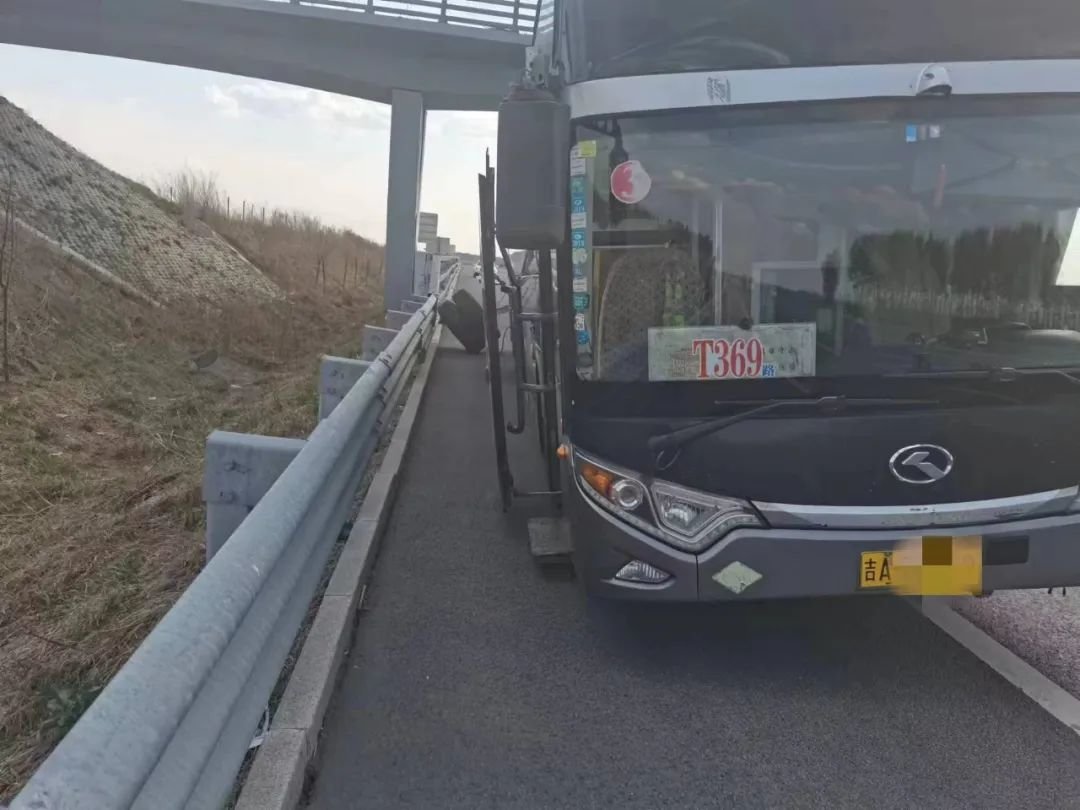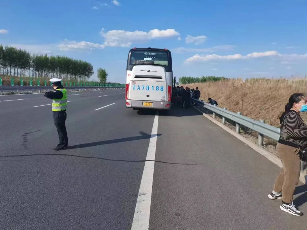 经询问得知,这辆客车载有52人,是从长春发往德惠的公交车,该车行经此处突然发生爆胎不能行驶。了解情况后,民警先将车内乘客引导至护栏外安全地带,之后让客车驾驶人通知客运公司安排车辆转运乘客,同时通知施救单位前来施救。