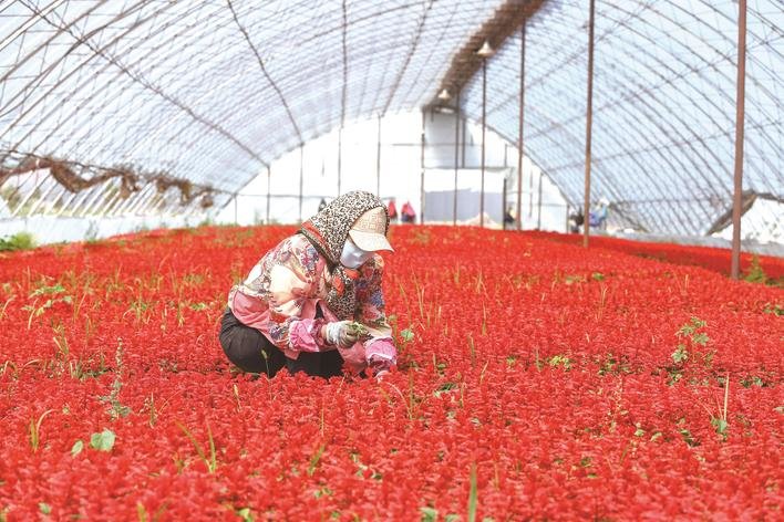 近年来,长春市九台区卡伦湖街道东风村利用当地种植资源丰富、交通便利等区位优势,积极调整农业产业种植结构,引导农民发展花卉、蔬菜、瓜果等特色种植业,进一步拓宽农民增收致富渠道。图为5月23日,在长春市九台区卡伦湖街道东风村,农民在为花卉除草。