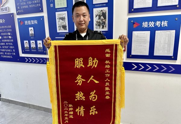 近日,一面写有“服务热情,助人为乐”的锦旗送到了长春机场安检现场,对安检员张亚春的积极主动、热情周到的服务表示感谢和认可。