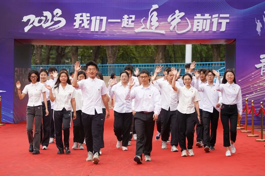 6月20日,长春理工大学在东校区体育场举行2023届学生毕业典礼。伴着阵阵欢呼声,毕业生代表们走过红毯,在学校精心设计的“追光·逐梦·前行”纪念墙前合影留念。