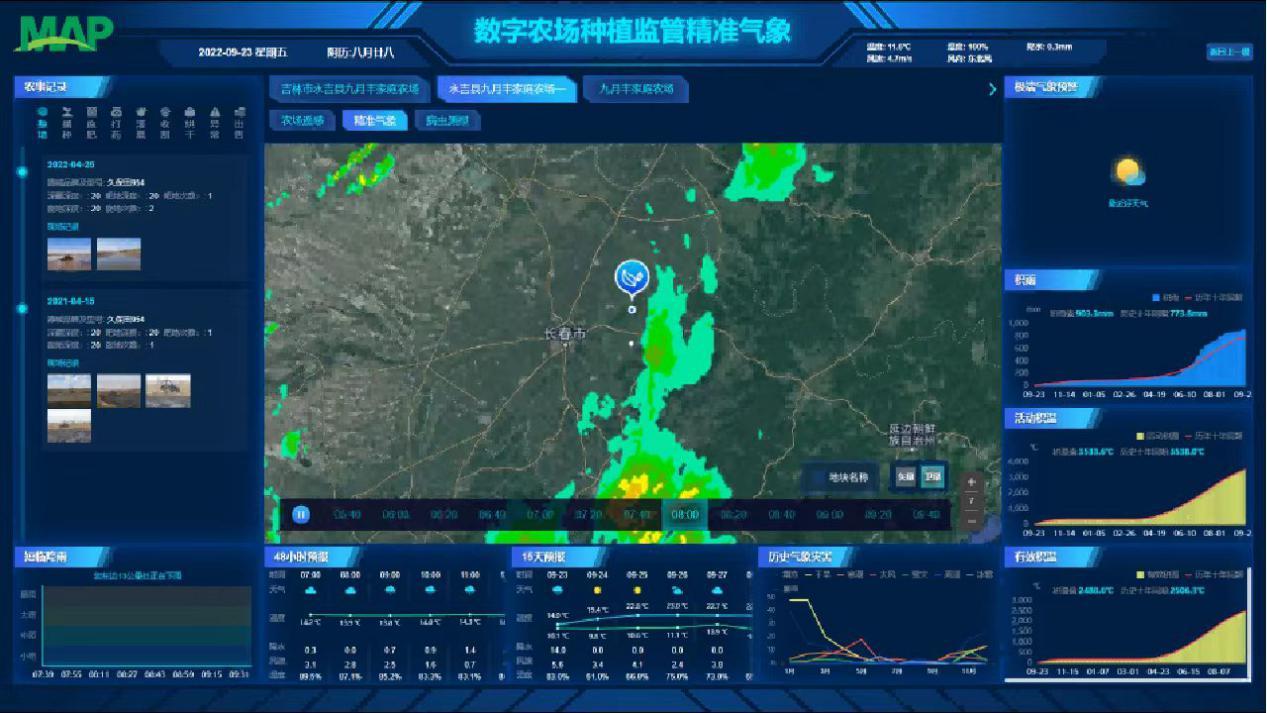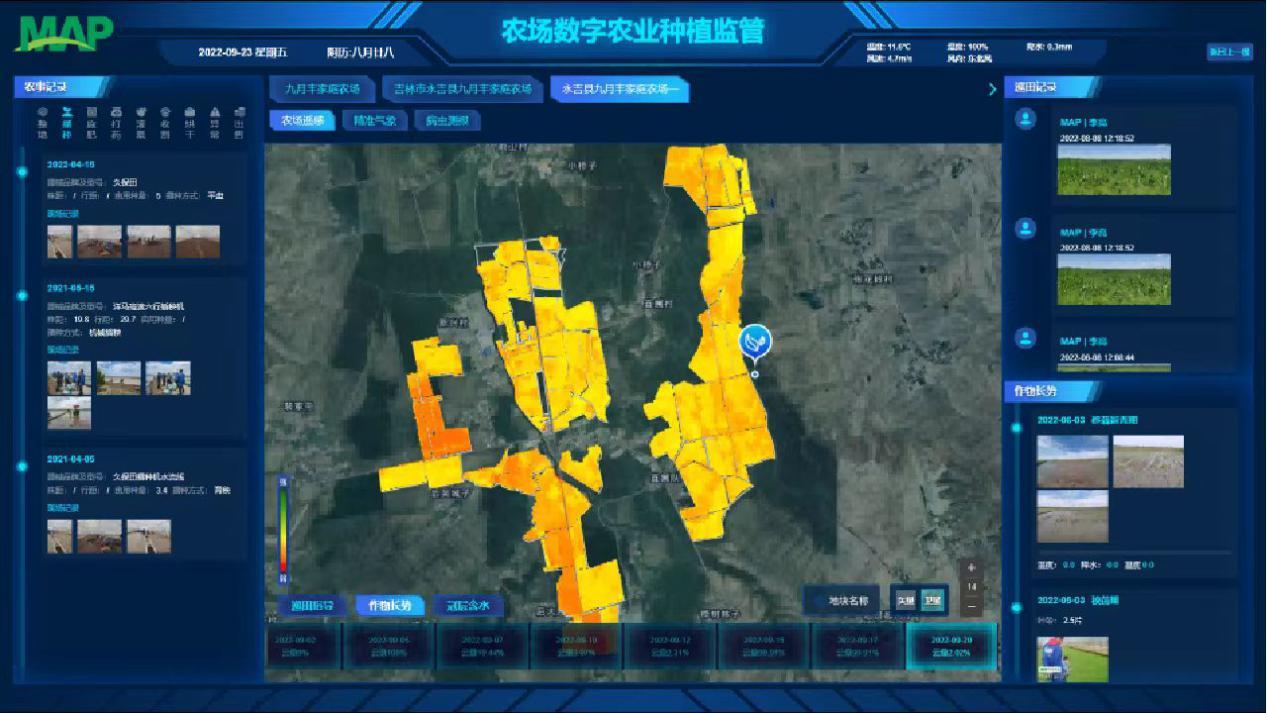 吉林市永吉县九月丰家庭农场率先推行“可视农业”和“私人定制”营销模式,利用基于“可视农业”的农业技术服务平台,打通传统农业与互联网的壁垒。通过建立地面摄像头、低空无人机、外太空遥感卫星的多层立体管控平台,对春季作物耕种、夏季田间管理、秋季收割入库和运输等全流程实施远程监控。