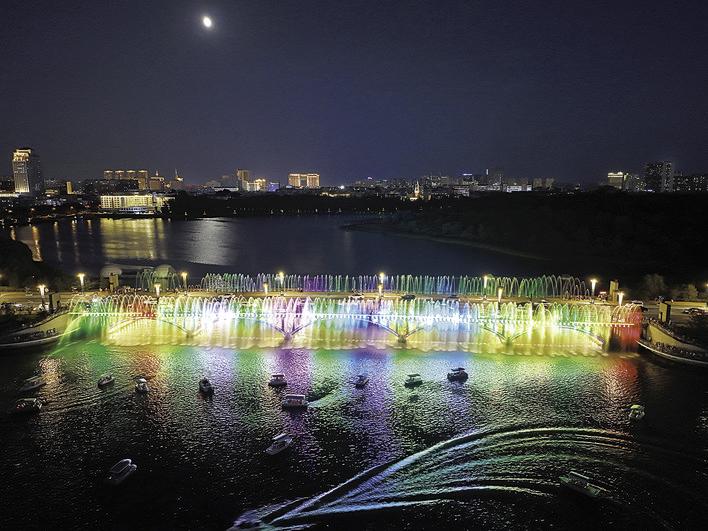 夜幕降临,华灯初上,城市的夜晚热闹起来。南湖大桥上,沙滩浴场上,水面的游船上,人们共同将目光聚向南湖大桥音乐喷泉。优美的音乐响起,一条条水柱在大桥两侧喷涌而出,彩灯与水柱交相辉映,形成一道道彩色的水幕。水幕随着音乐起伏,好像一排排彩色的音符。美丽的喷泉仿佛夜色中的彩虹,使游人流连忘返。