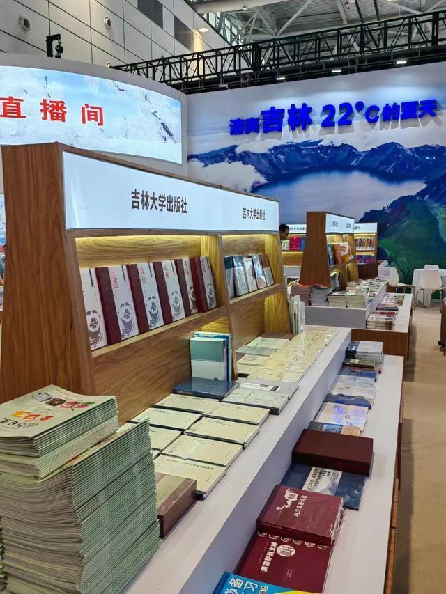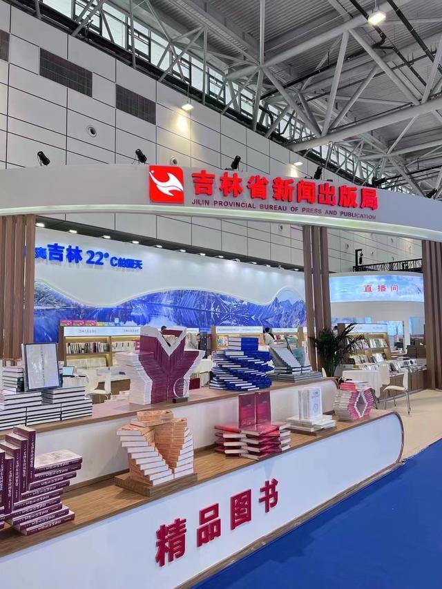 吉林展团突出新时代书展的价值和发展方向——以书为媒,不止于展,跨界破圈,串联行业上下游,多角度展示吉林元素。整体设计以弧形建筑造型统领,双弧形结构恰似一本翻开的书,书写吉林故事。主背景板的长白山天池和其上方“清爽吉林 22°C的夏天”宣传语,以“书博”之名,向全国读者发出一封来自吉林的邀请函。精品展区位于展台前方中部,突出典籍造型,彰显吉林文脉。包括吉林人民出版社第十六届精神文明建设“五个一工程”奖获奖图书《掌握“看家本领”》、北方妇女儿童出版社第八届中华优秀出版物获奖图书《长大后我想成为你》、吉林文史出版社特色产品《名碑名帖传承系列》、长春出版社全国畅销图书《毛泽东诗词鉴赏》、东北师范大学出版社国家出版基金资助项目《教师教育思想史研究》、延边教育出版社民族文字出版资金资助项目《大自然,请与我为伴》等一系列重磅图书。集中展示吉林出版在推动文化高质量发展方面的新作为、新气象,吸引了不少读者驻足。
