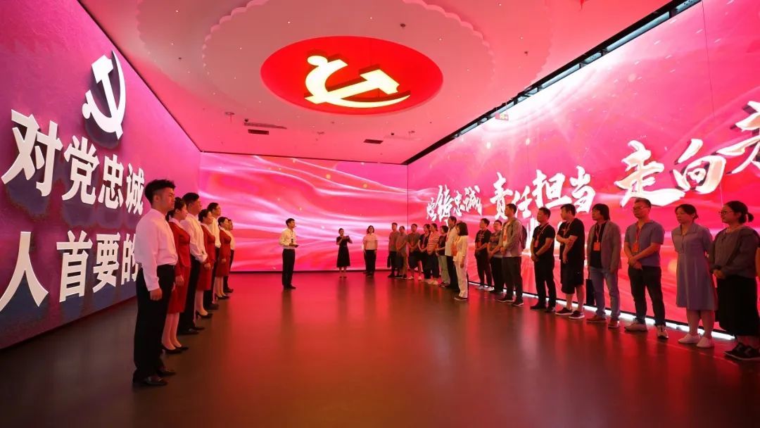 步入教学馆全包围式LED屏的序(尾)厅,“‘对党忠诚’是中国共产党人首要政治品质”映入眼帘,字重千钧。直击心灵的教学片中,一代代共产党人如熠熠火焰,照亮征程,引发学员们的强烈共鸣。