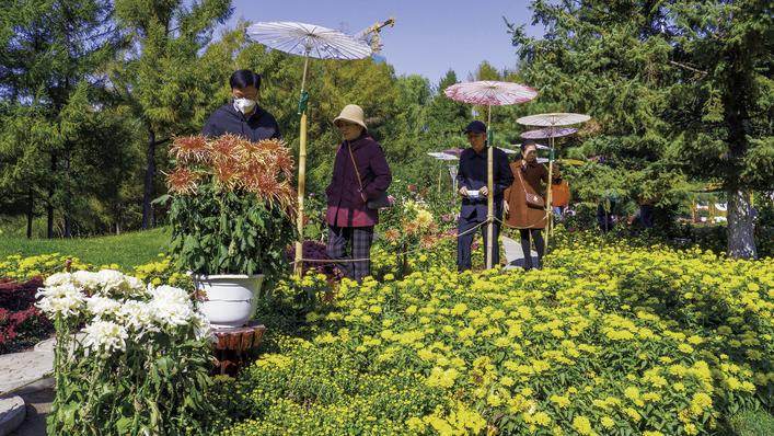 金秋十月,菊花正值花期,百花园举办“菊韵飘香醉春城”秋季菊花展,近万株形态各异的菊花在百花园3000余平方米的专项展区中绽放。本次花展通过多种园林造景手法,以不同品种的菊花为展出对象,为市民提供赏花游玩的好去处。图为市民在展区观赏盛开的菊花。