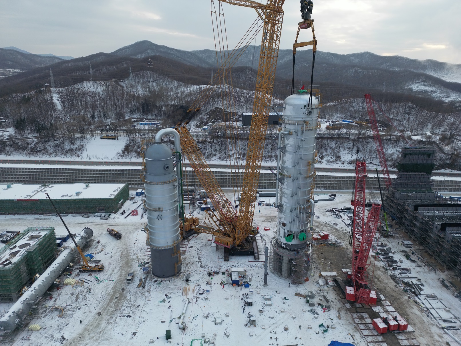 日前,吉林石化公司炼油化工转型升级120万吨/年乙烯装置急冷油塔起吊安装就位。