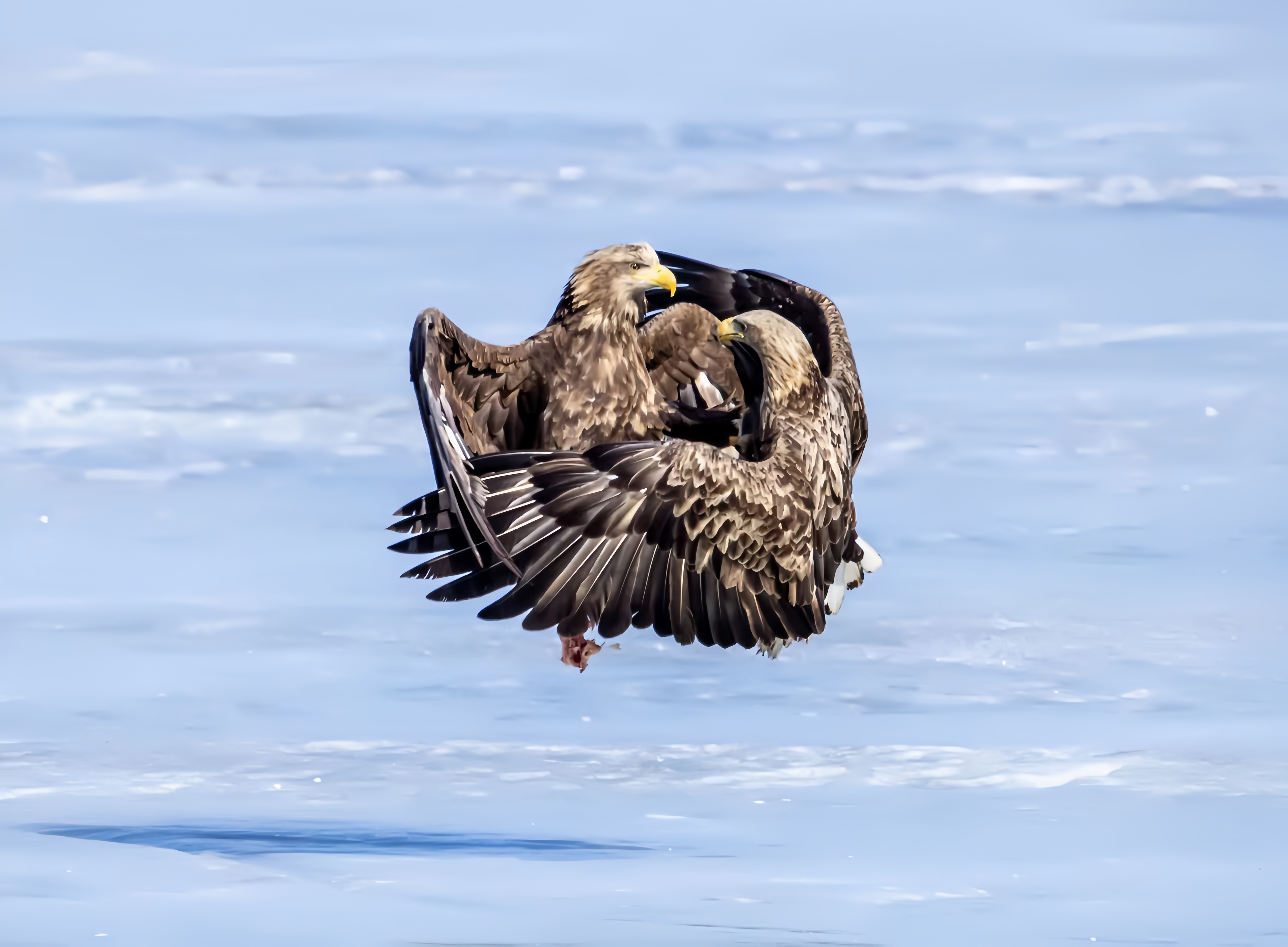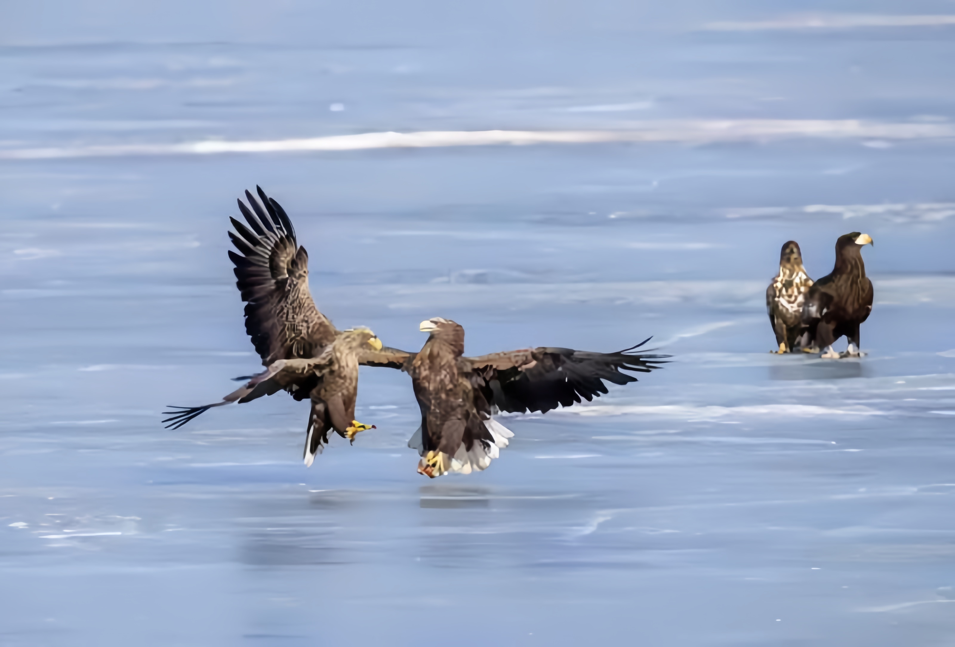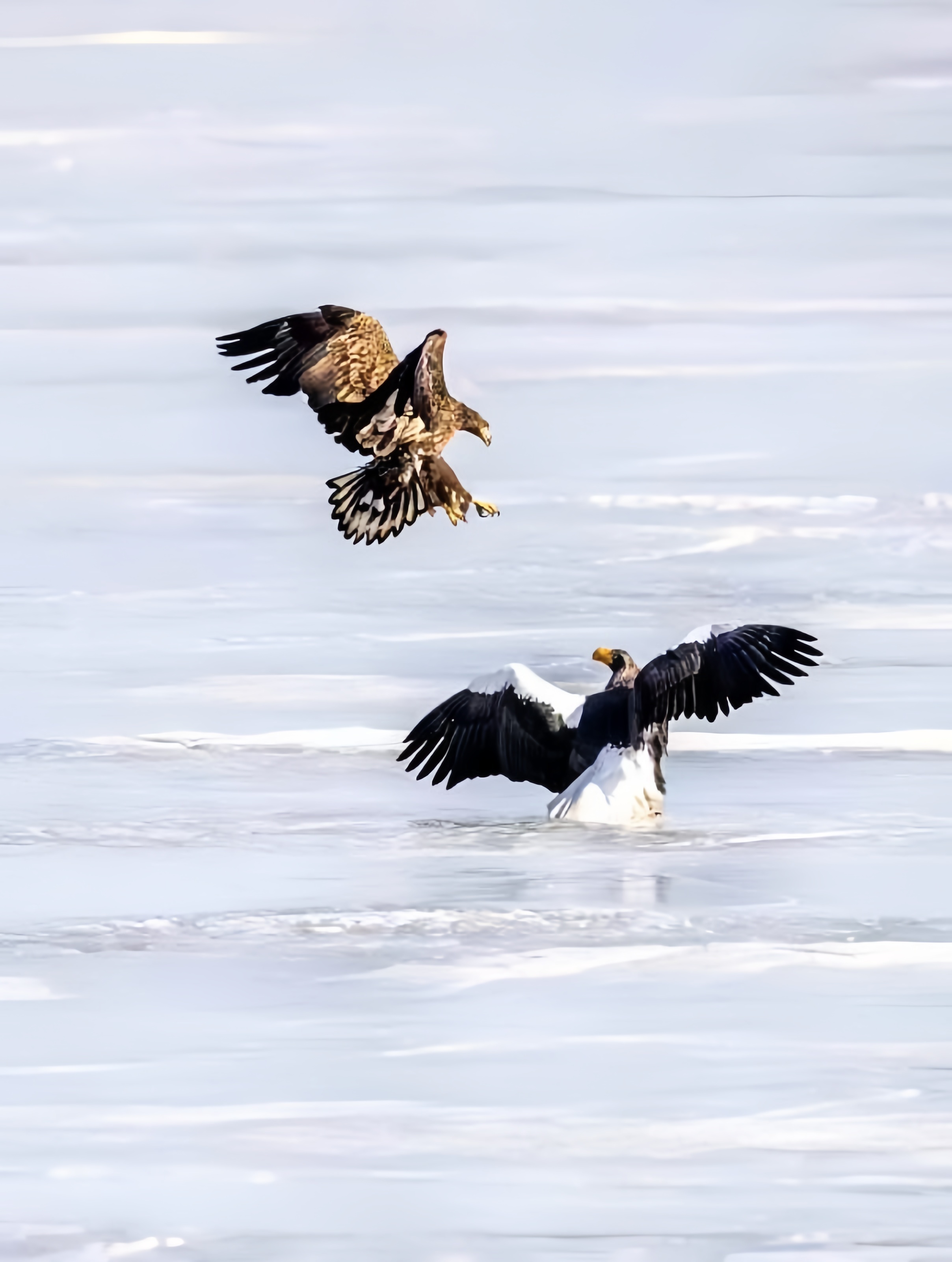 虎头海雕为国家一级保护动物,隼形目鹰科海雕属鸟类,别名虎头雕、羌鹭、海雕。嘴特大,黄色;体羽大都黑褐色,具灰褐色纵纹;额、肩、腰、尾上及尾下覆羽、腿覆羽及尾羽均为白色;下体浓褐色,胸羽有淡色纵纹;尾楔形;尾羽有14枚;虹膜、蜡膜和趾等均为黄色;爪黑色。它们无论凌腾高空,或是停歇于枝头、海滨,都展现出不凡的王者气度。