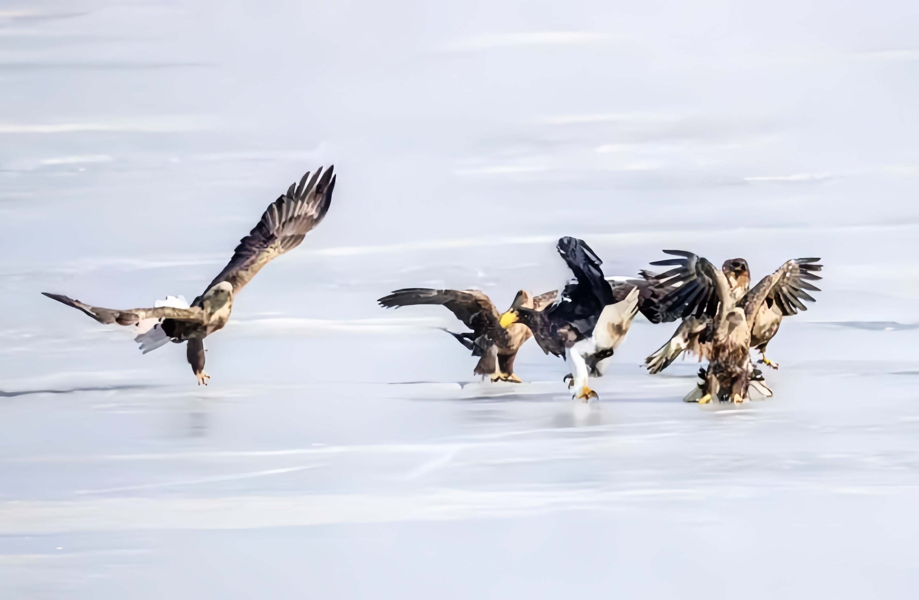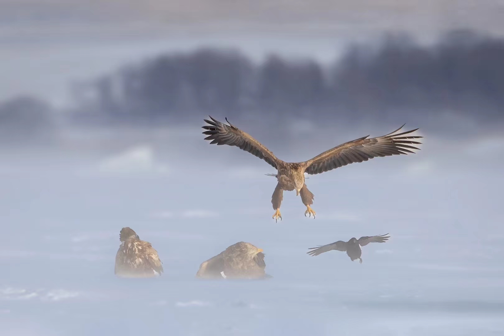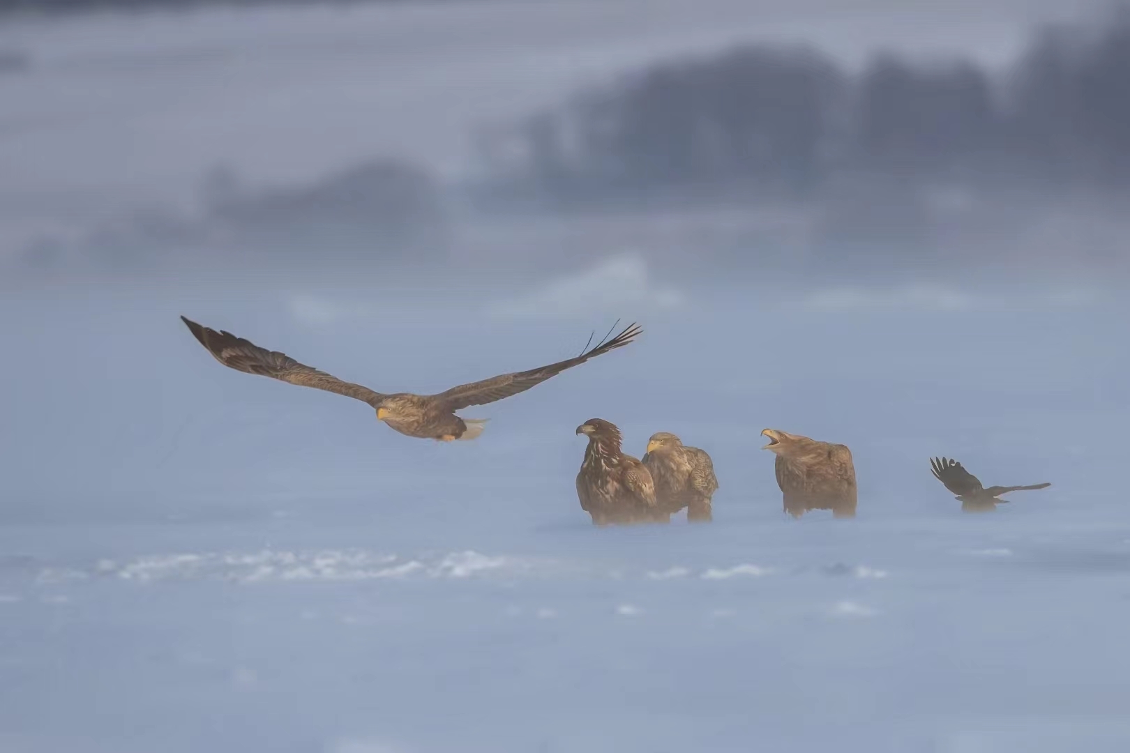 连日来,珲春市敬信湿地迎来一大批猛禽驻足觅食,白尾海雕、虎头海雕、秃鹫等稀有猛禽争相亮相,再度吸引全国各地的摄影爱好者在此聚集,开启“摄雕”模式。