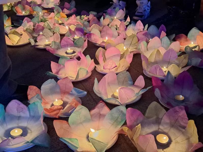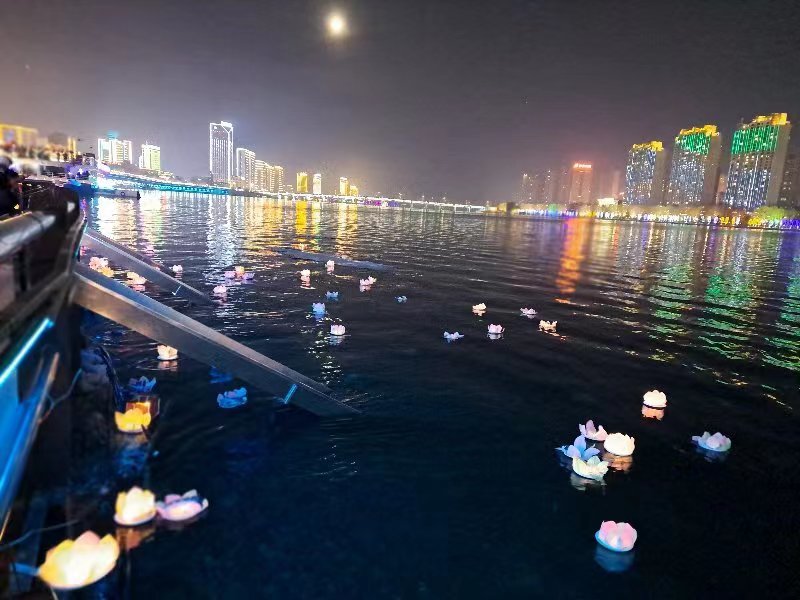 活动现场,一排排制作精美的莲花河灯承载着祝福与祈盼顺流而下,与一江两岸的霓虹夜色遥相辉映,流光溢彩,天上烟花次第绽放,江上99米长的游龙竹筏花灯缓缓驶过,市民放飞的孔明灯在一轮满月映衬下如点点繁星闪烁,北国江城吉林市呈现出“万盏河灯耀松江”的壮观场面。市民李女士说,能参与放河灯她非常高兴也很荣幸,她希望通过放河灯祝福祖国繁荣昌盛,祝福江城更上一层楼,百姓生活越来越美好!
