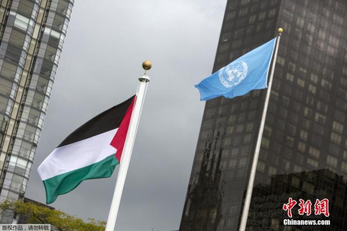 资料图:当地时间2015年9月30日,巴勒斯坦国旗在位于美国纽约的联合国总部前徐徐升起。