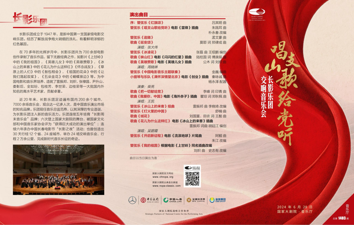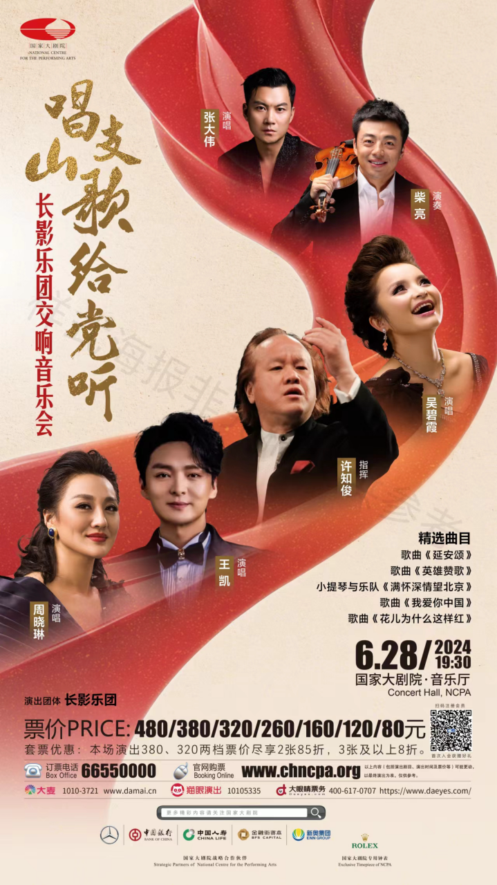 6月28日19时30分,长影乐团将连续第二年在国家大剧院向党献礼,与指挥家许知俊、抒情花腔女高音歌唱家吴碧霞、男高音歌唱家王凯等艺术家们,共同奏响《唱支山歌给党听》主题交响音乐会。