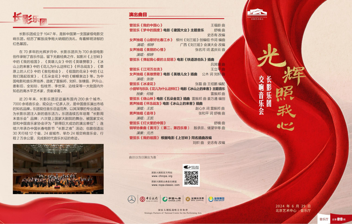 长影乐团精心策划筹办的这两场演出,选曲以经典电影插曲改编为主,旨在用经典歌颂经典。特别是长影出品的电影《上甘岭》插曲《我的祖国》、电影《冰山上的来客》插曲《花儿为什么这样红》、电影《英雄儿女》插曲《英雄赞歌》、电影《创业》插曲《满怀深情望北京》等等,都是耳熟能详、经久不衰,被一代又一代中国人传承下来的历史经典与红色记忆。