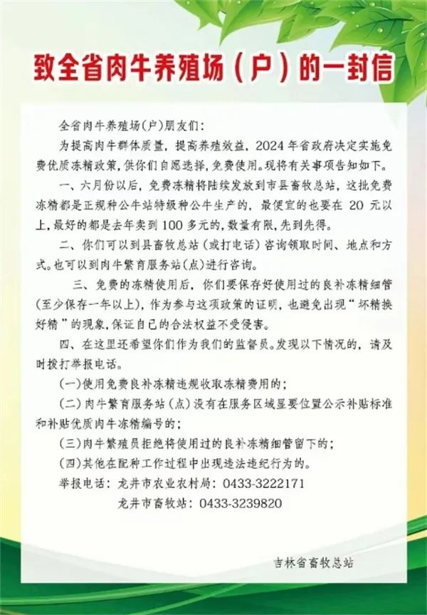 为贯彻落实省委农村工作会议、全省畜牧业工作会议精神,加快全省肉牛遗传改良进程,提高肉牛群体生产性能,推动全省肉牛产业提质增效、实现健康发展和可持续发展,确保全面完成全年新增百万头肉牛饲养量任务目标,推动“秸秆变肉”暨千万头肉牛建设工程顺利实施。2024年,吉林省政府在全省范围内实施优质肉牛冻精补贴项目,免费发放冻精供养殖场(户)自由选择。