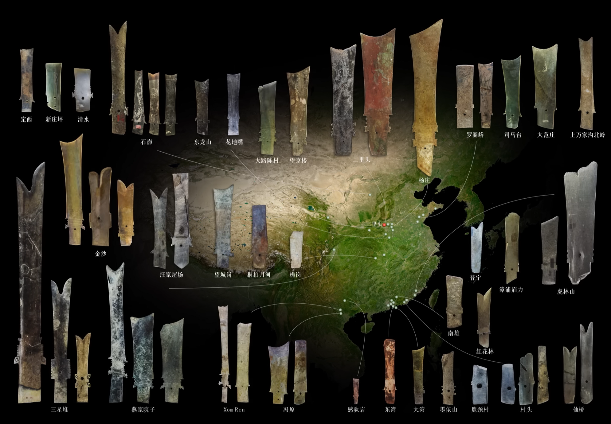 另一方面,在文物呈现的场景和背景上,要么极简化,高光之下,文物本身的纹理和质感被突出,彰显高超制作工艺和技法的同时得以窥见文明的底蕴;要么场景化,或是将文物置于“出土现场”中,展现文物重新面世时的荣光,或是还原文物的使用场景,与历史现场相融。该片对陶文化、青铜文化、玉文化、龙文化、礼乐文化的呈现多遵循于此。此外,团队还设计了文物呈现的视觉动线,让常规的静态文物动态化,丰富了对文物的观赏视点。如对于凌家滩遗址出土的玉石器呈现,创作团队大胆将之按照随葬顺序复原,按照上层、中层、下层、底层复原摆放,仿佛带领观众穿越到5000多年前的新石器时代。