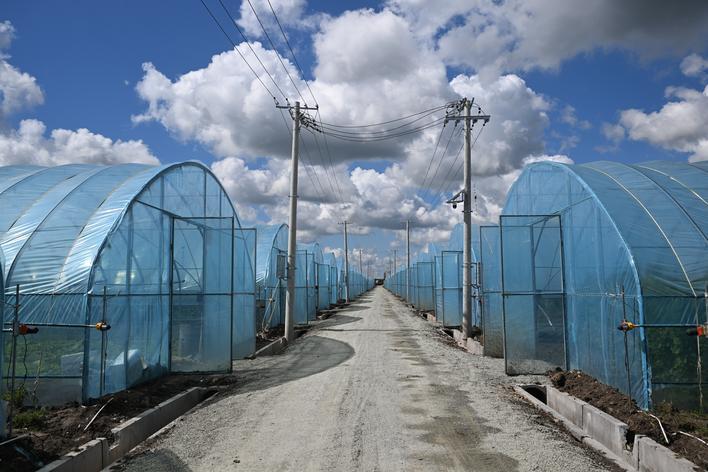 目前,农安县合隆镇朱家园子村万亩棚膜项目已建设大棚128栋,建设面积达22.1万平方米,其中,56栋已经完成覆膜并投入使用。