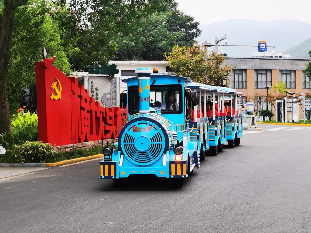 在横坎头村新时代文明实践中心,一列满载乘客的观光小火车正准备出发。一条美丽田园观光游路线,将横坎头村与相邻的汪巷村、甘宣村的大小景点相连,成为一条连接村庄的共富纽带。