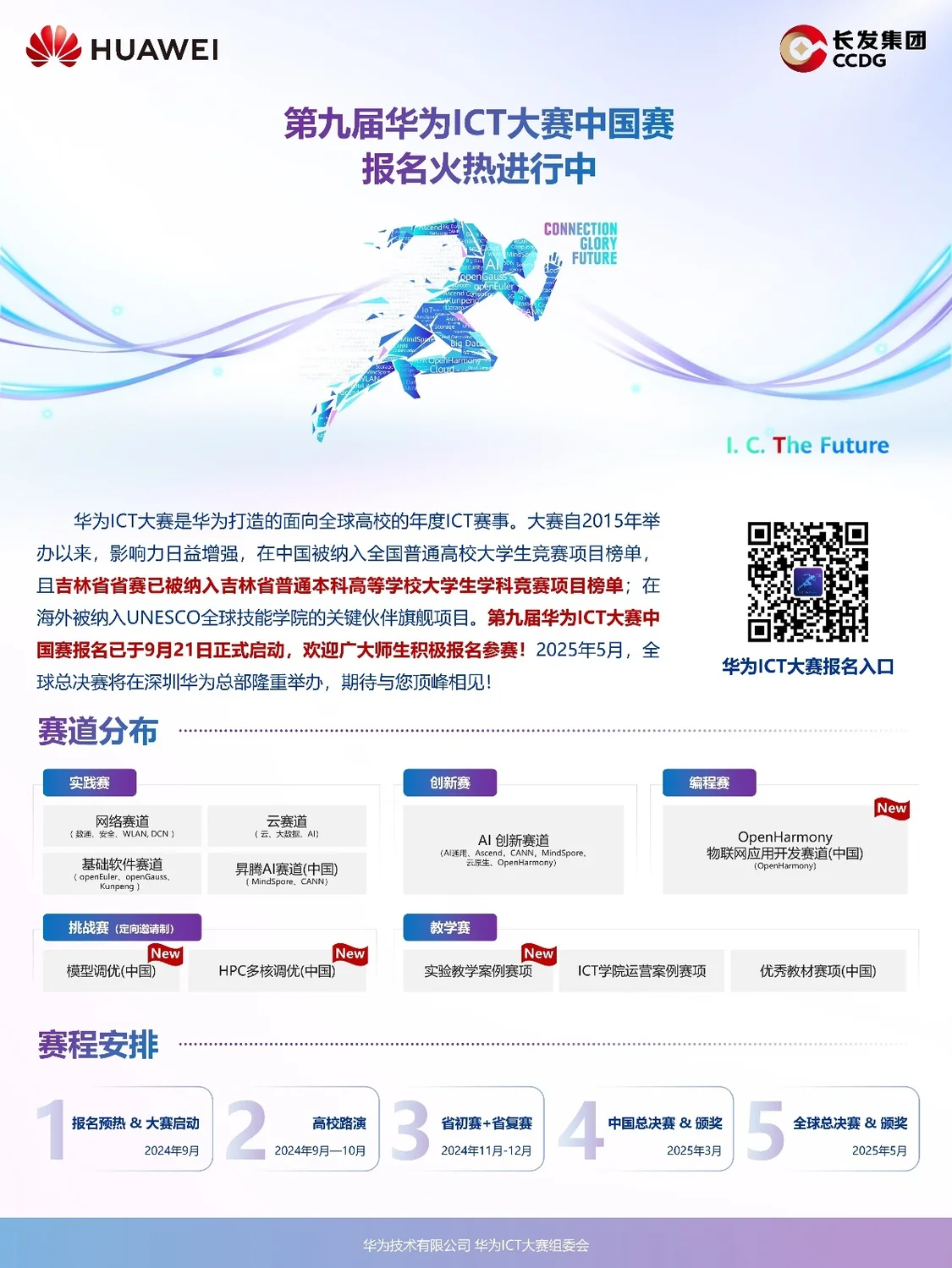 如今,第九届华为ICT大赛于9月21日再度启航,涵盖实践赛、创新赛、编程赛、挑战赛以及教学赛五个赛项。其中,实践赛包含四个赛道,分别为网络赛道、云赛道、基础软件赛道和昇腾AI赛道。本届华为ICT大赛中国赛吉林省省赛已纳入吉林省普通本科高等学校大学生学科竞赛项目榜单,欢迎广大师生积极报名参赛!2025年5月,全球总决赛将在深圳华为总部隆重举办,期待与您顶峰相见!
