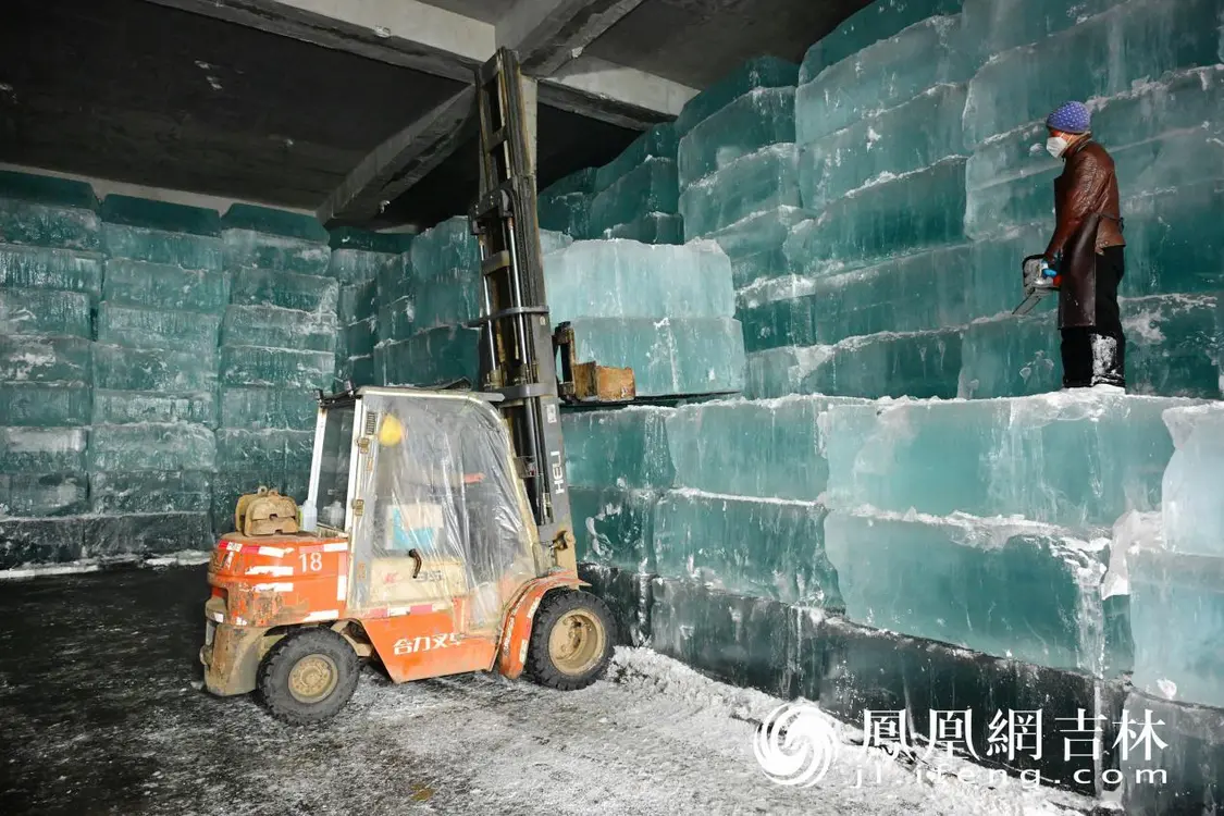此次取出的是上个雪季存储的冰块。这些用完之后,园区还将从附近的湖中取冰用于建造。