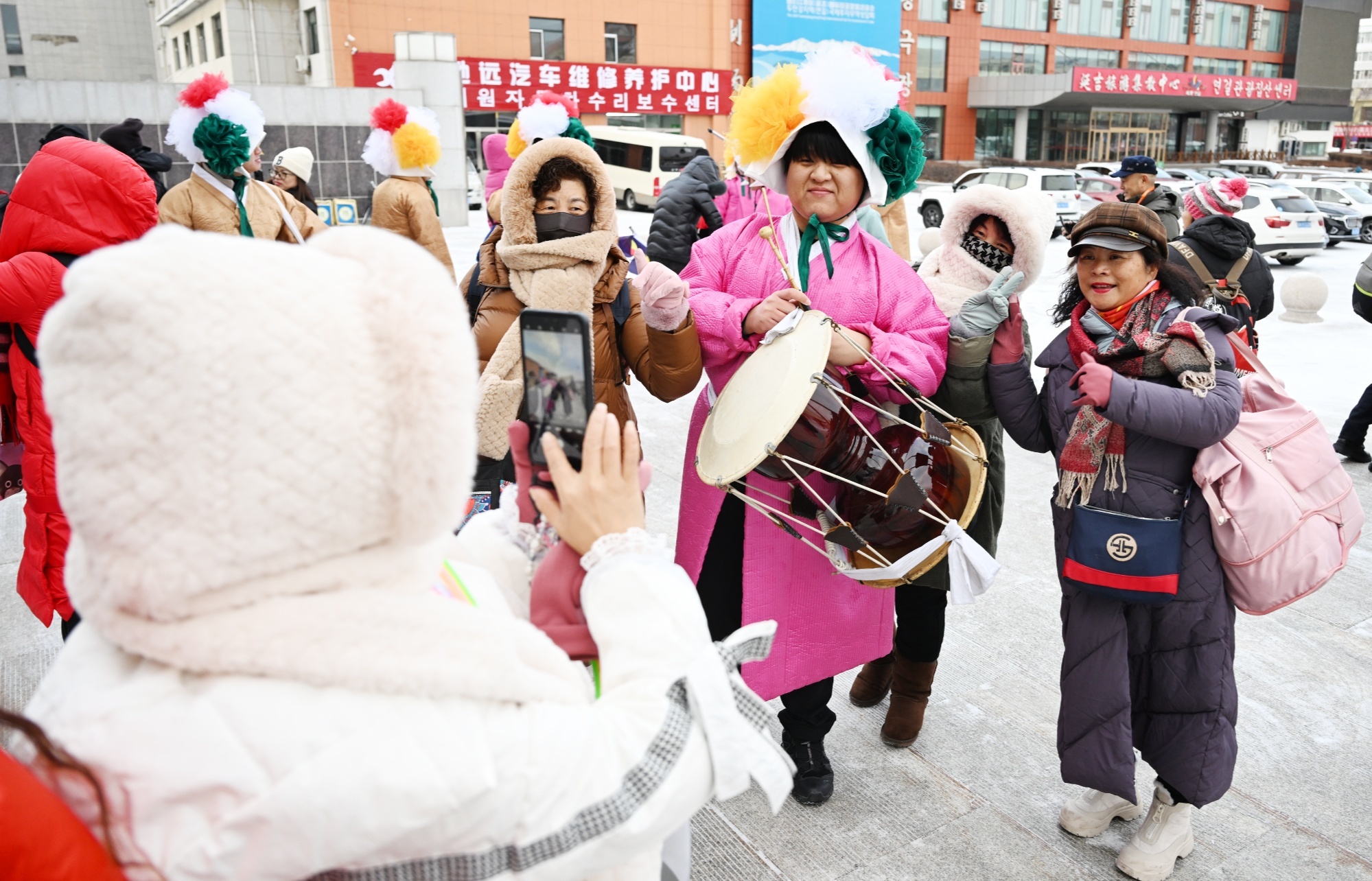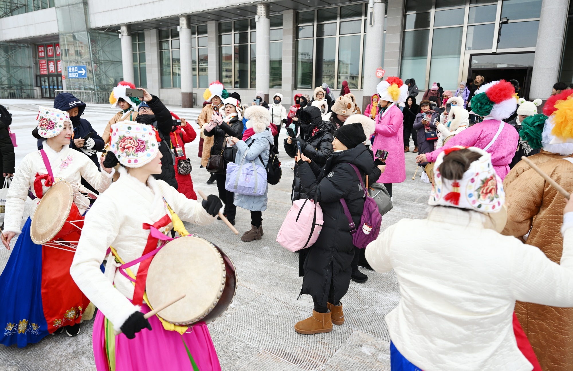 延吉市文广旅局组织延吉市文化馆的演员表演了《农乐舞》,热烈欢迎游客们的到来,大家纷纷合影留念。游客们抵达延吉后将参观中国朝鲜族民俗园、延吉网红弹幕墙,并将前往长白山、敦化、哈尔滨等地,游览雪乡、长白山天池、沈阳故宫等景区,开展为期13天的旅程,深度体验东北冬季美景和民俗文化。