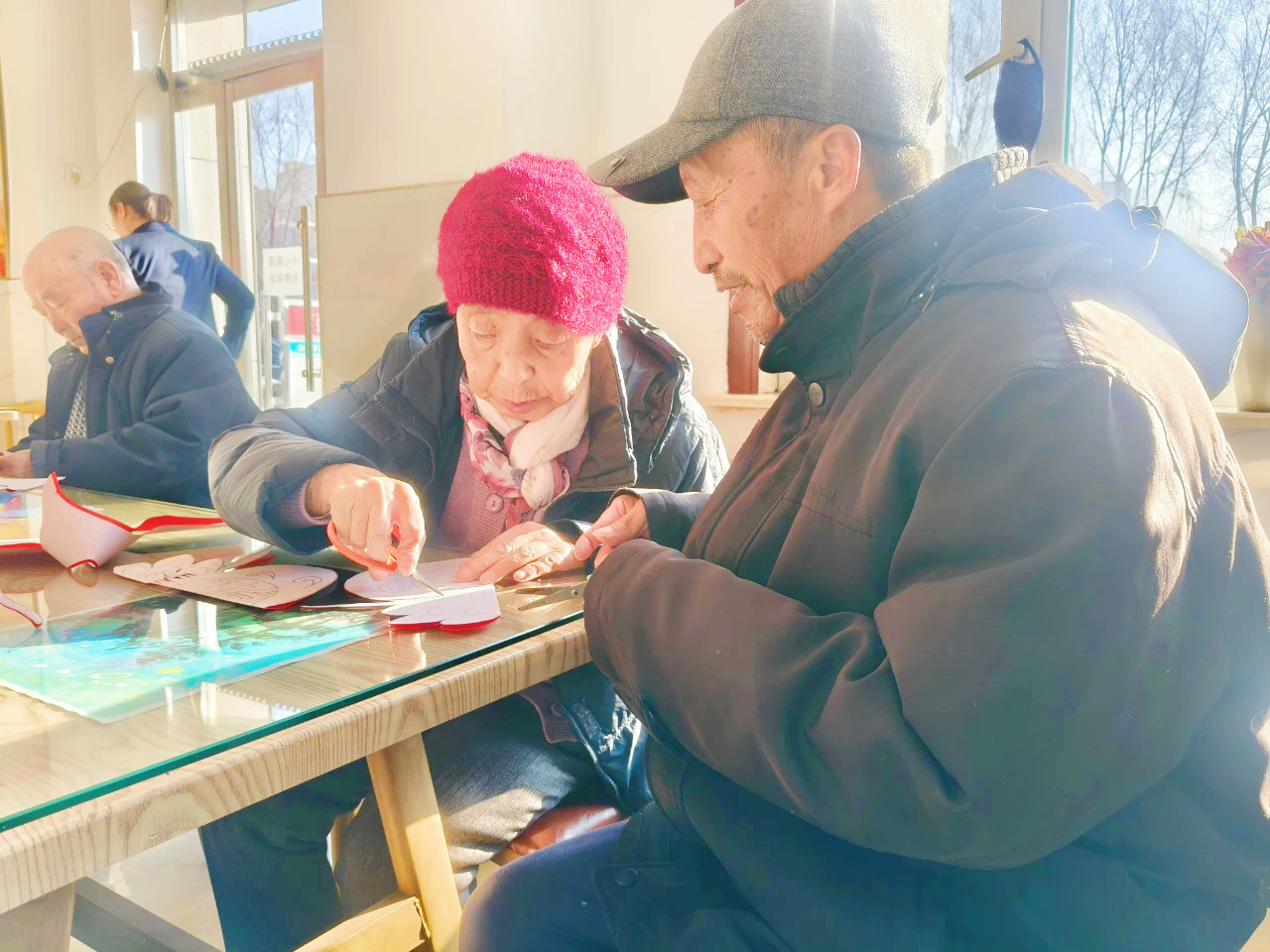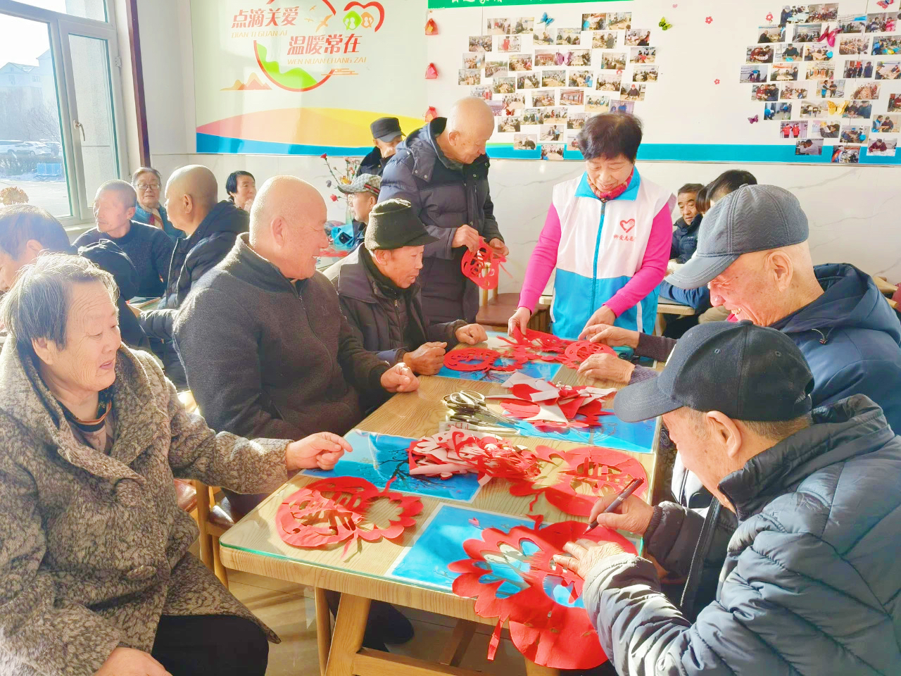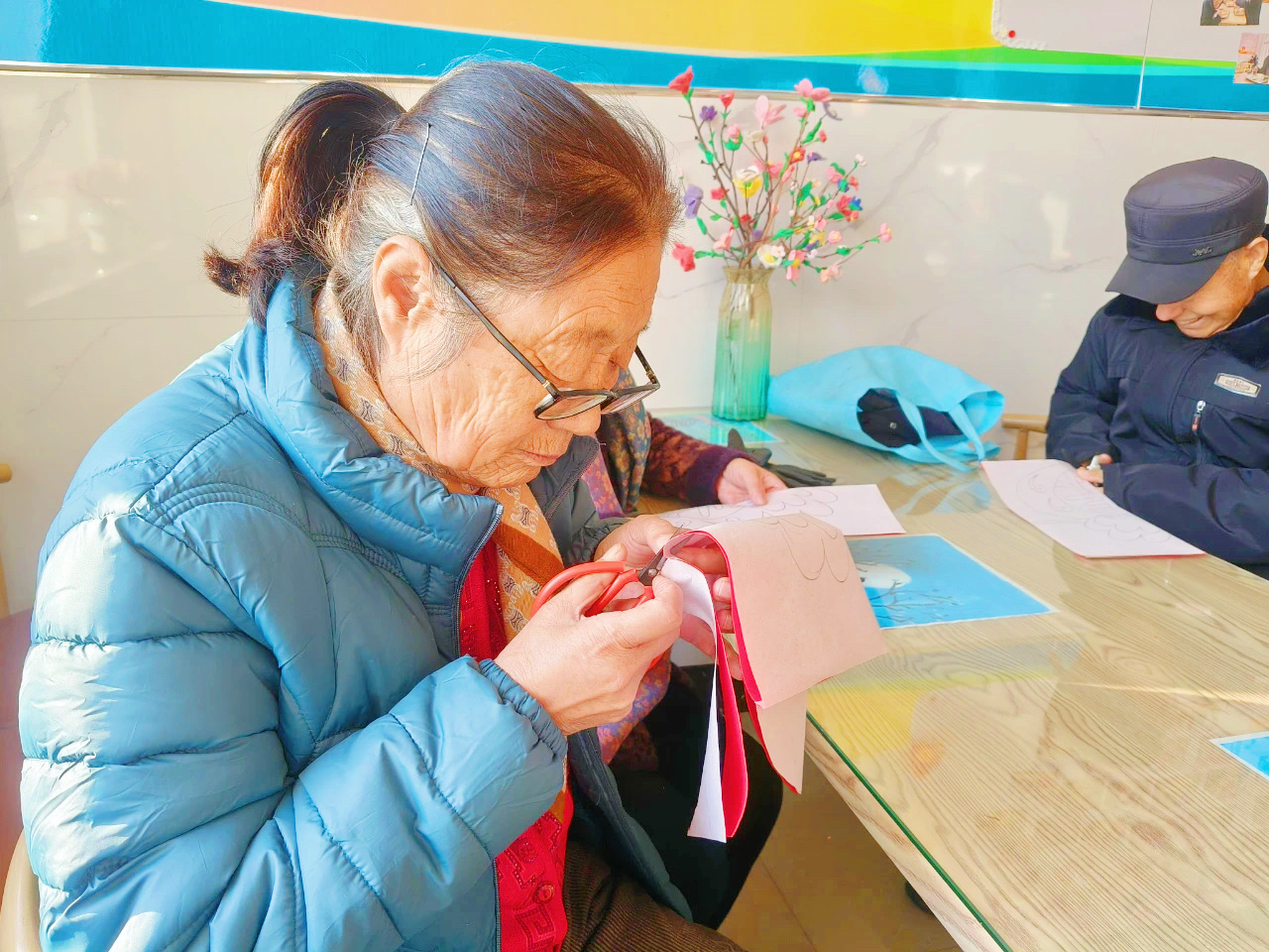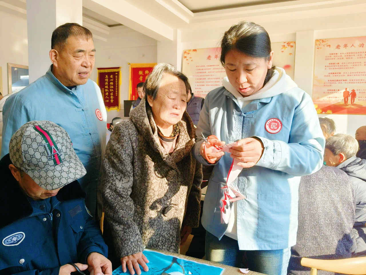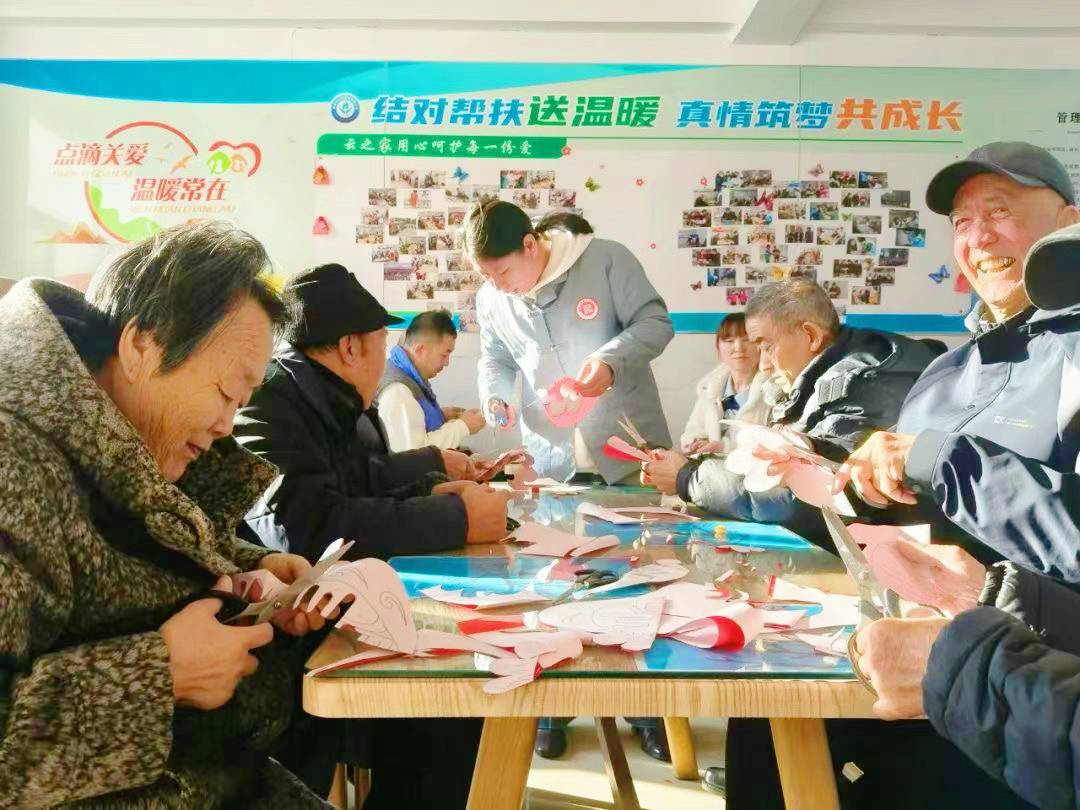 活动中,王霏手持剪刀,将古老而精美的剪纸技艺展现在大家面前。老人们围坐在一起,十分投入地倾听、学习。随着王霏的巧手翻飞,一张张红纸在她的剪刀下迅速“变身”,化身为一个个栩栩如生、寓意吉祥的剪纸作品。老人们也拿起剪刀,跟着王霏老师开启了自己的剪纸之旅。