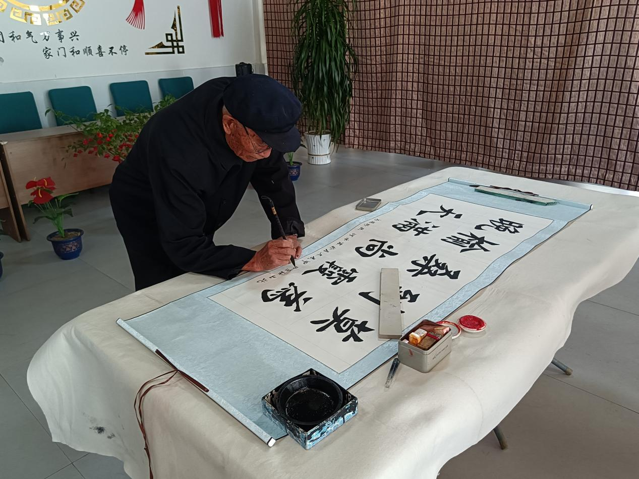 “莫道桑榆晚,为霞尚满天。”露水河镇书法家协会的书法家现场挥毫泼墨,并将饱含着浓浓祝福的书法作品赠送给老人。