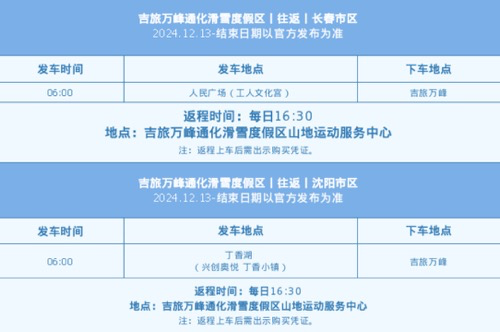 此外,通化市还开通了长春、沈阳往返吉旅万峰的免费冰雪直通车,长春市、沈阳市的群众及在读大学生到万峰滑雪度假区购买一日游索道票或自营酒店住滑产品(五洲皇冠酒店、万峰假日酒店,鹿鸣温泉酒店、万峰瑞士酒店,观山公寓酒店),均可免费乘坐冰雪直通车。