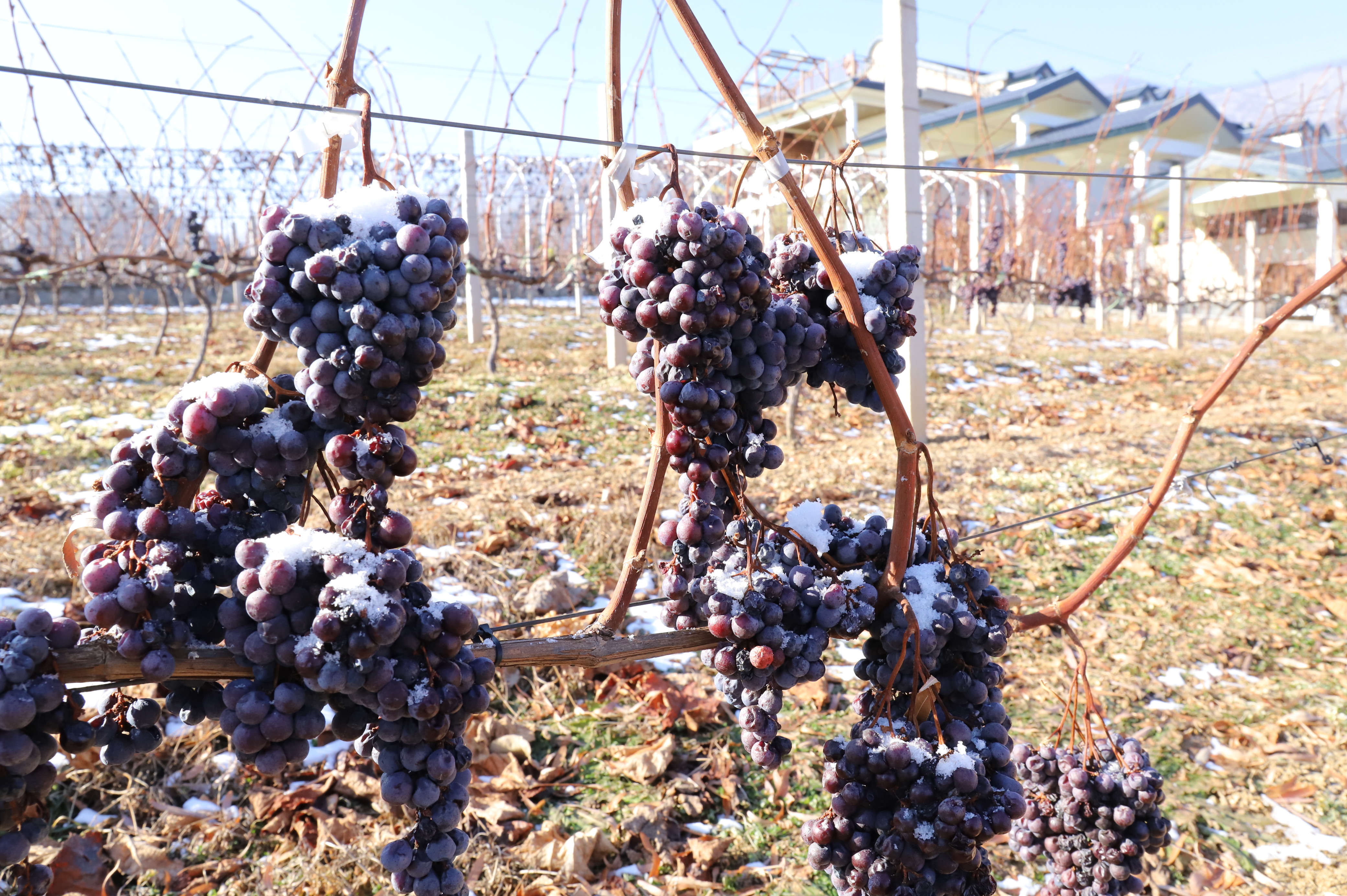 通常,九月是葡萄丰收的好时节,而在集安鸭绿江河谷地带,冬日成为这里最热闹的时刻。当葡萄在藤蔓上结起冰晶,工人们在清晨加紧采摘,并直接送到生产厂房,带冰压榨。