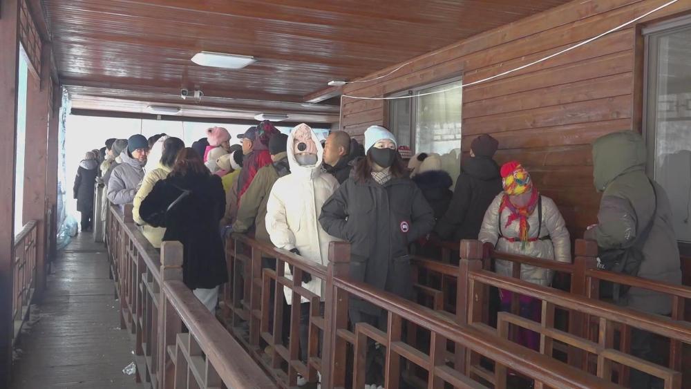 在集安市五女峰国家森林公园,众多游客被1520米的超长雪道吸引,他们早早来到售票处,在工作人员的指引下有序排队等待观光车接送。