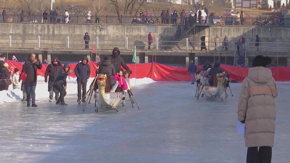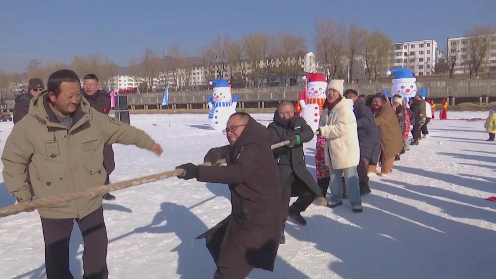 在集安市通沟河平湖冰雪乐园,冰上龙舟、双拐爬犁接力、冰雪拔河等比赛轮番上演。参赛选手齐心协力,释放运动激情,尽享冰雪乐趣。
