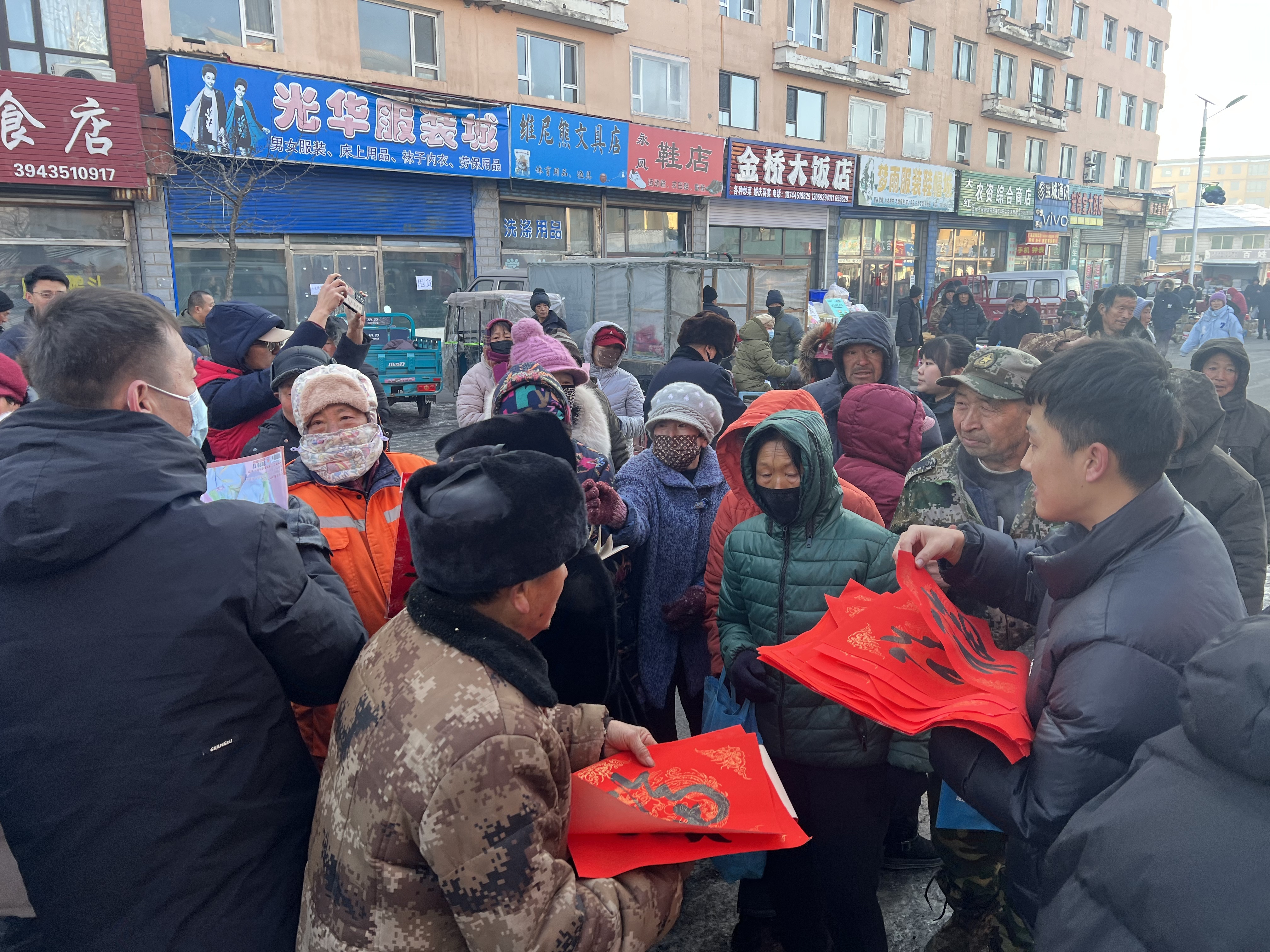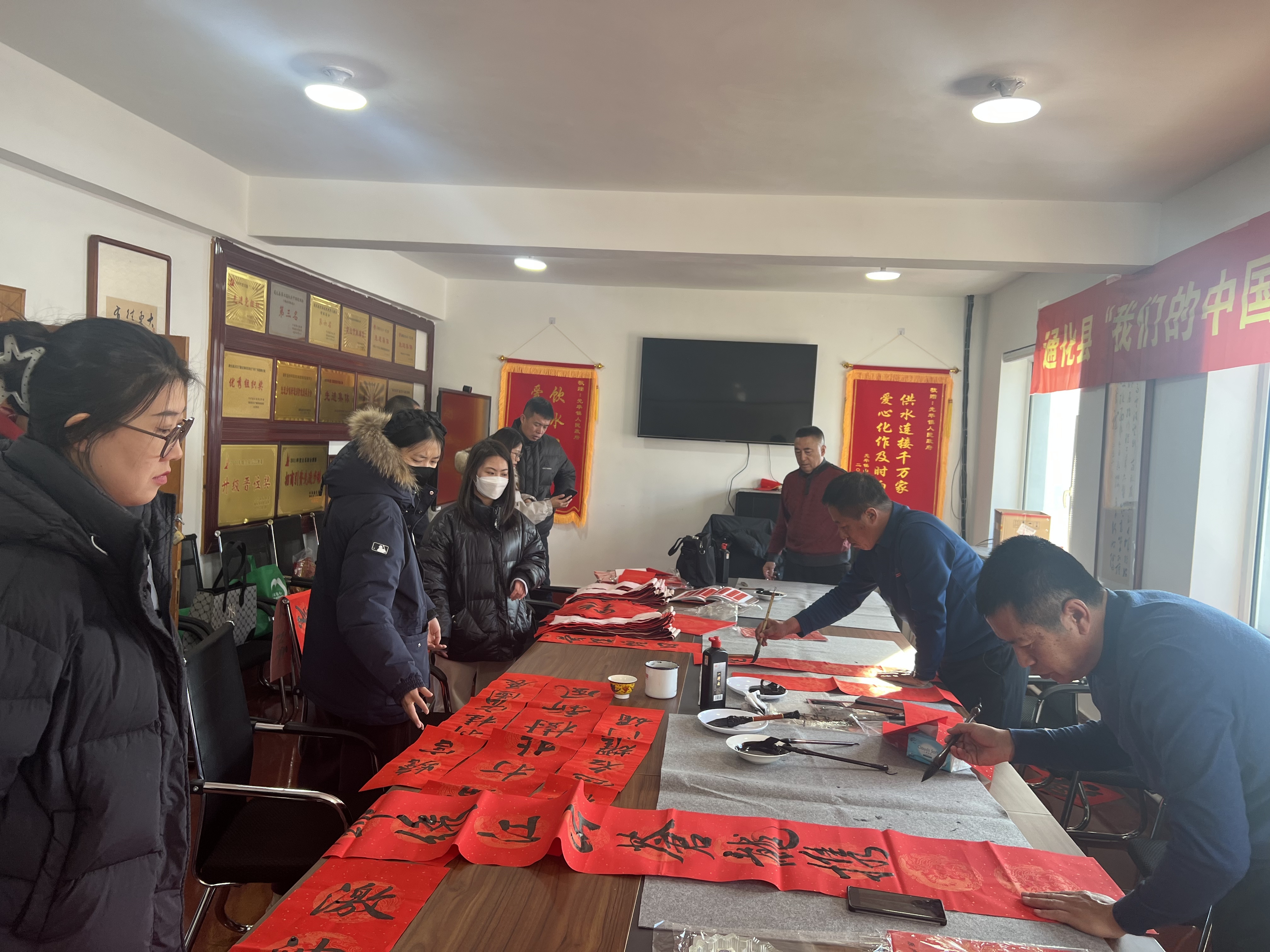 一边是文艺爱好者们载歌载舞,一边是通化县书法家协会的志愿者们挥毫泼墨,为群众免费书写春联。现场,一张张红纸在书法家们的笔下变得灵动起来,一行行俊秀苍劲的书法、一句句墨香四溢的语句跃然纸上,不仅为群众送上喜迎新春的问候和美好祝福,也展现了中华书法艺术的魅力。