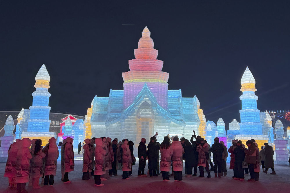 2024年12月26日,游客在哈尔滨冰雪大世界园区内拍照游玩。新华社记者杨思琪 摄