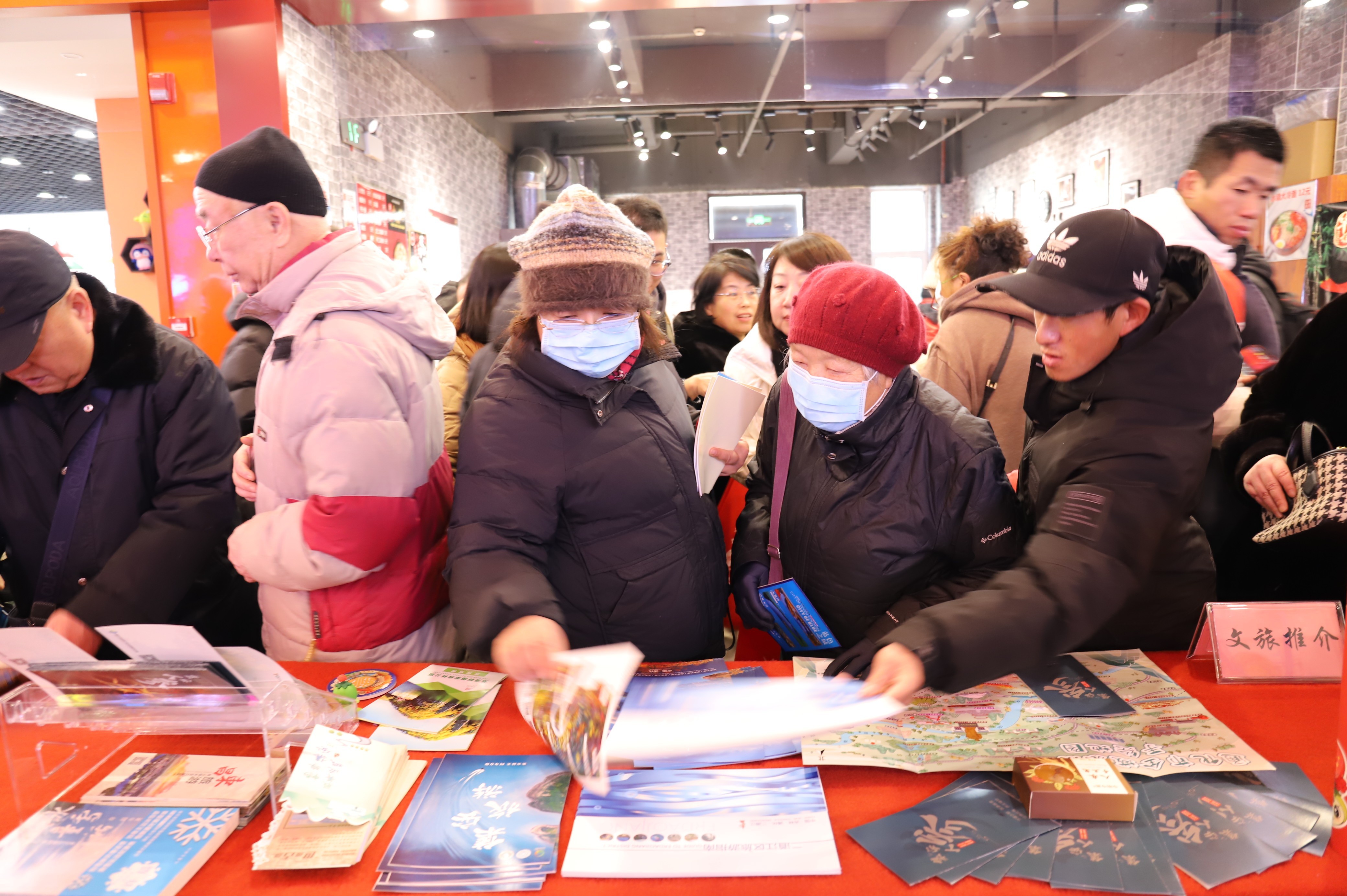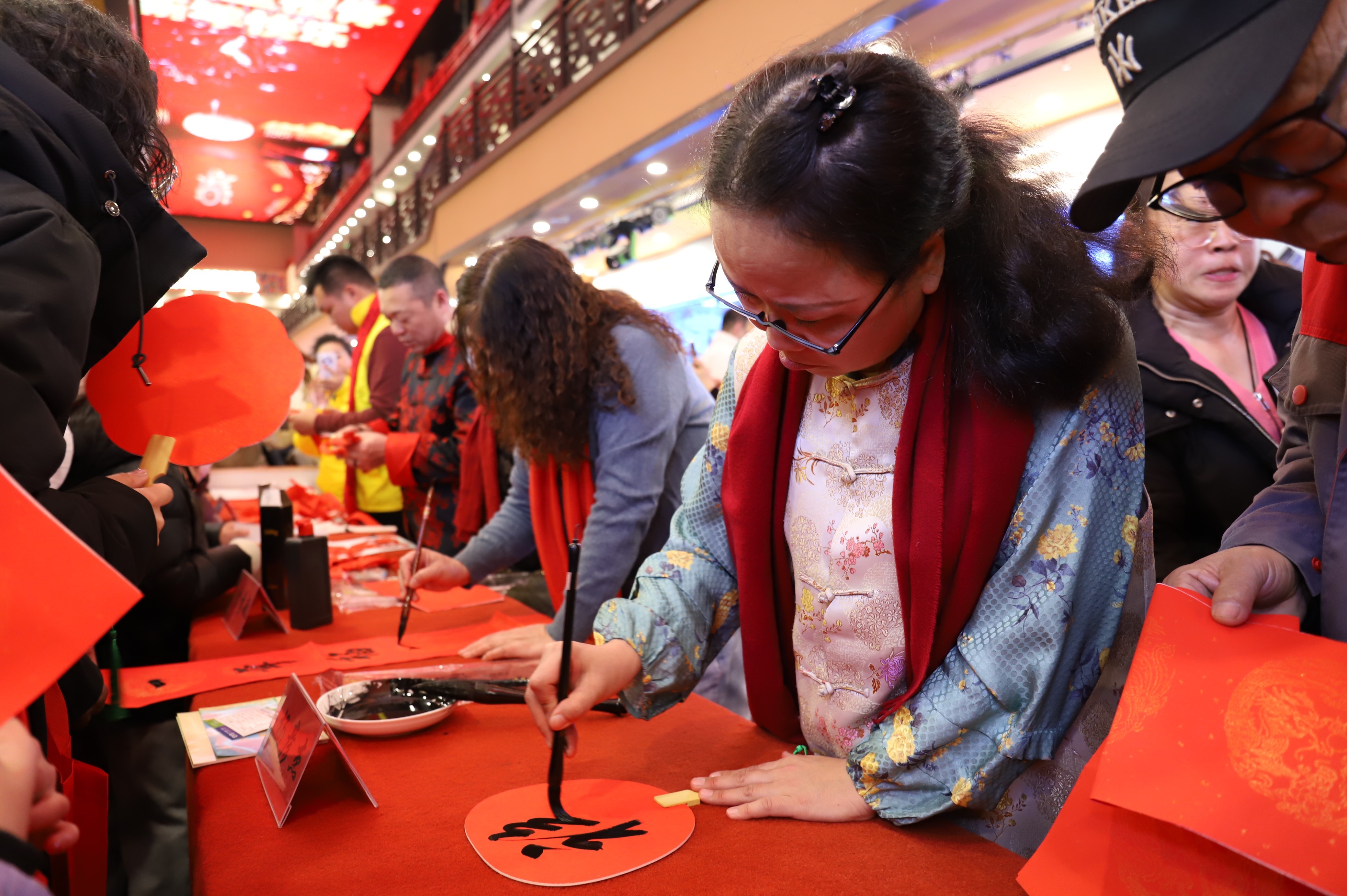 文化市集里,书法家、民间文艺家铺展红纸,笔墨飞舞贺新春,巧手剪纸送福至,免费创作的春联、长白山满族剪纸等作品“福”气满满,市民、游客围聚桌前,领取新年祝福。