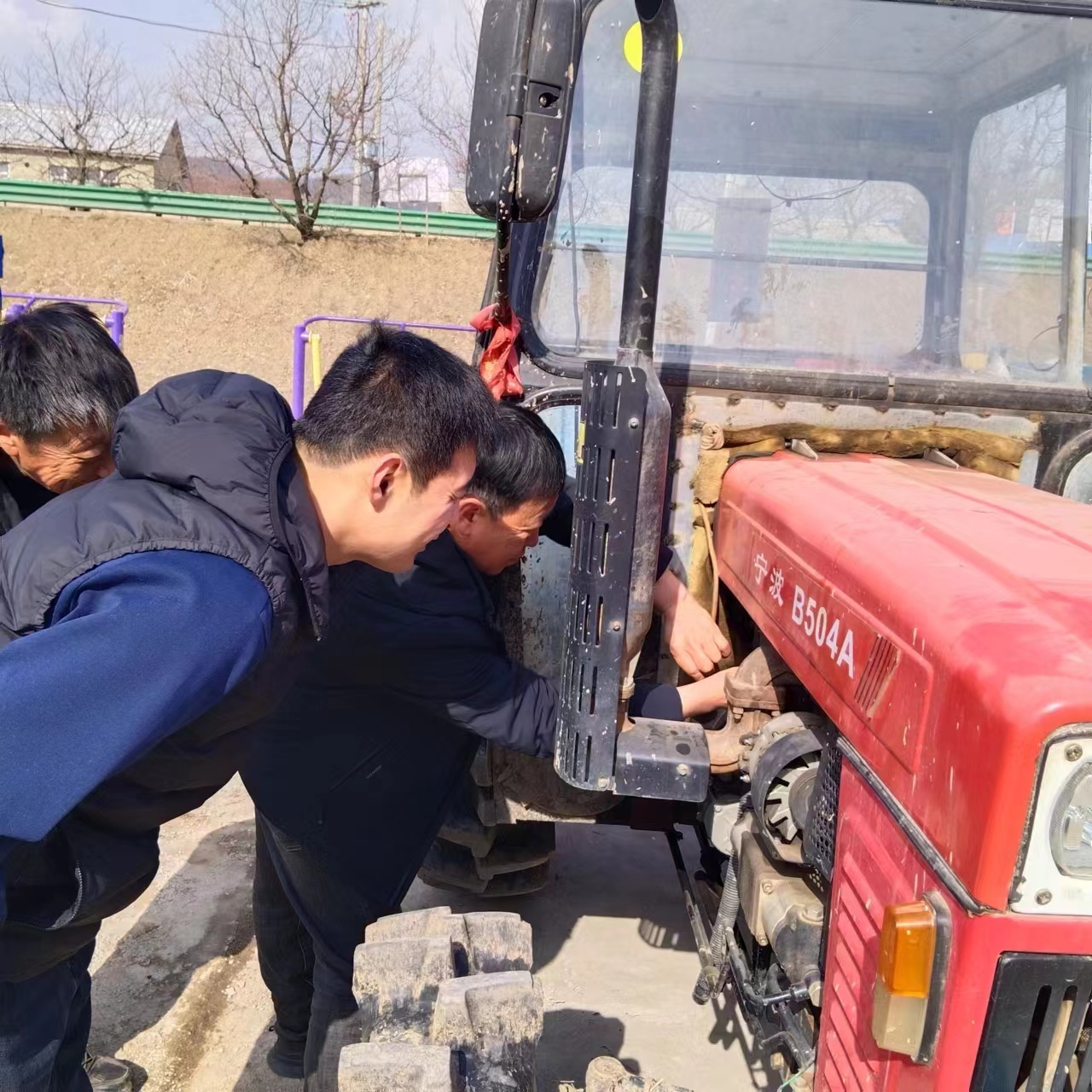 王宝财拿着扳手,熟练地拧下一颗颗螺丝,查看发动机内部状况,嘴里念叨着:“春耕可不等人,机器要是在地里‘闹脾气’,那可就误大事了。咱得像照顾亲人一样,把它的每个‘关节’‘筋骨’都调试到最佳状态。”一旁的年轻人认真听着,边递工具边学习,传承着老一辈精耕细作的经验与执着。
