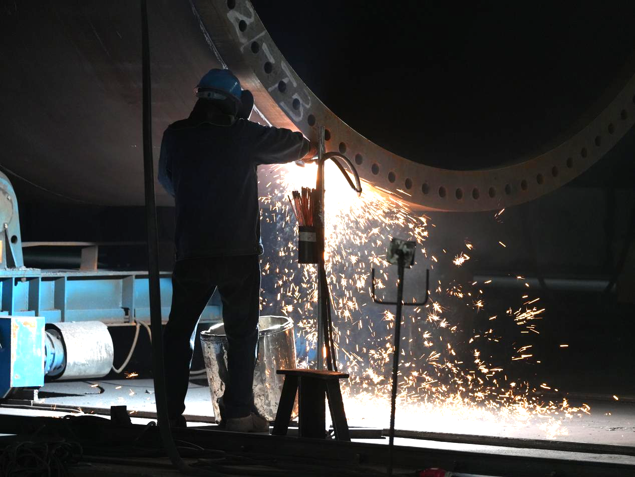 作为风力发电机组的重要支撑,风电塔筒的“强壮”程度,决定着风电机组是否能够良好运转。在通榆天能重工有限公司风机塔筒生产车间,机器轰鸣,火光闪烁,电锯声、焊接声不绝于耳。别看加工车间里都是“男子汉们”,他们干的都是精巧细致的“绣花活”,丝毫马虎不得,焊接处必须100%经过探伤检测,不能有裂纹、夹渣、气孔、未熔合、未熔透等情况。