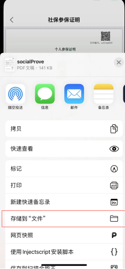苹果手机App点击“分享证明”可进行文件分享,点击“存储到文件”可将电子档保存到本地。