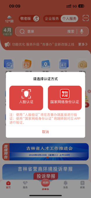 第一步:选择“人脸认证”方式进行身份认证。若选择“国家网络身份认证”方式进行验证,首次验证需要下载安装“国家网络身份认证”App,注册并绑定本人身份证。