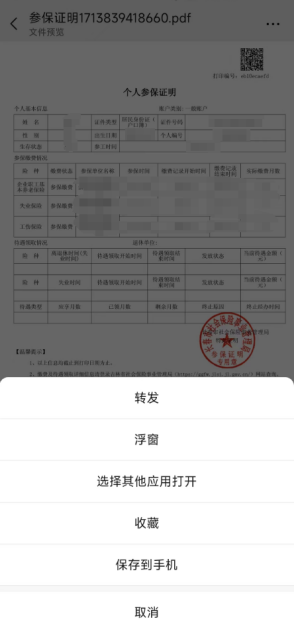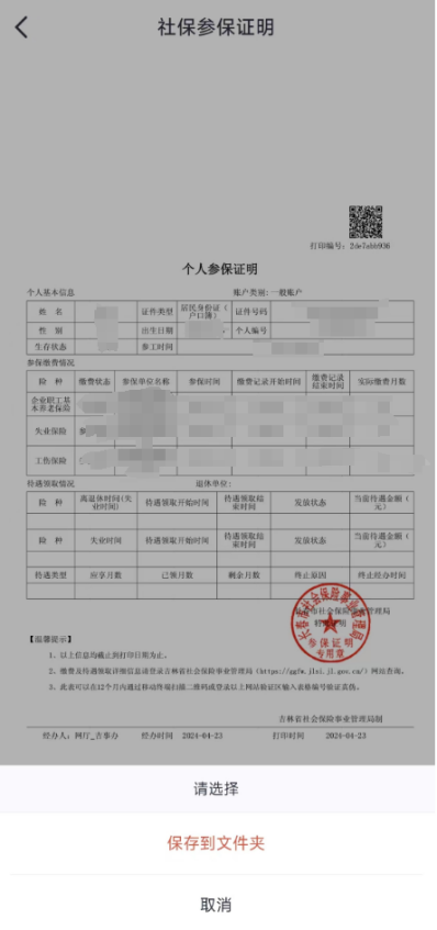 第二步:查看“社保参保证明”,安卓手机App长按“社保参保证明”选择“保存到文件夹”,即可将“社保参保证明”电子版保存到本地。