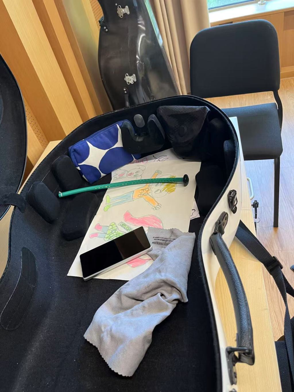 采访结束时,王健怀抱一把三百多岁的大提琴,为我们拉了巴赫《大提琴无伴奏组曲》第二组曲中的“前奏曲”,拉完这一段,他松了松筋骨说“再来一段!”又拉了第二组曲中的“阿勒曼德”。一旁的白色大琴盒里,放着女儿两三岁时画给爸爸的几张画,这些年一直躺在琴盒里陪着王健走遍世界各地。