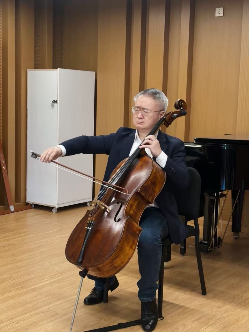 王健一共有4把大提琴。采访当天在上音琴房,王健用一把三百多岁的大提琴演奏巴赫《大提琴无伴奏组曲》片段。