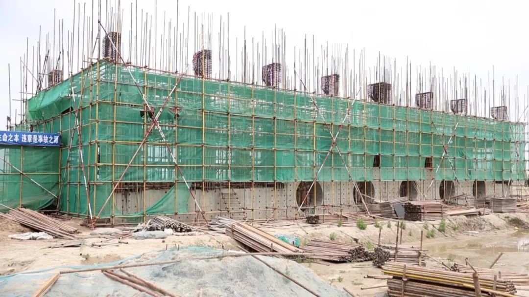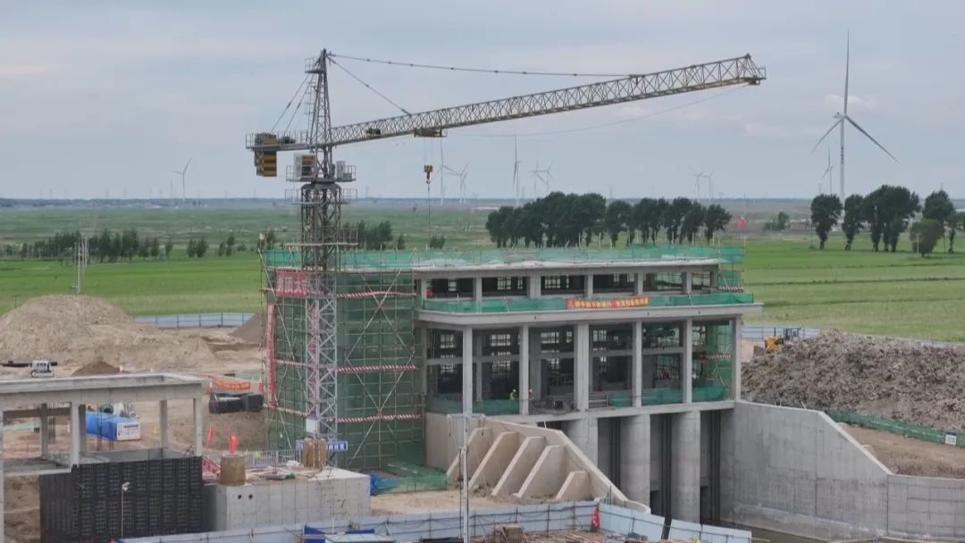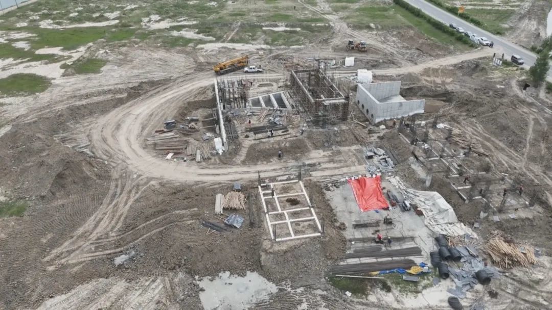 松原灌区(套浩太片区)工程的排水泵站施工现场,同样繁忙。在泵站的主厂房、副厂房及管理房区域,一根根粗壮的水泥立柱拔地而起,工人们正在搭建泵站主体结构,为后续安装提水设备做准备。