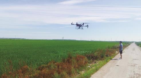 镇赉县大河生态农业有限责任公司是镇赉水稻种植大户,目前稻田生机勃勃。图为公司员工正在用无人机喷洒叶面肥。 (本栏图片均由镇赉县委宣传部提供)