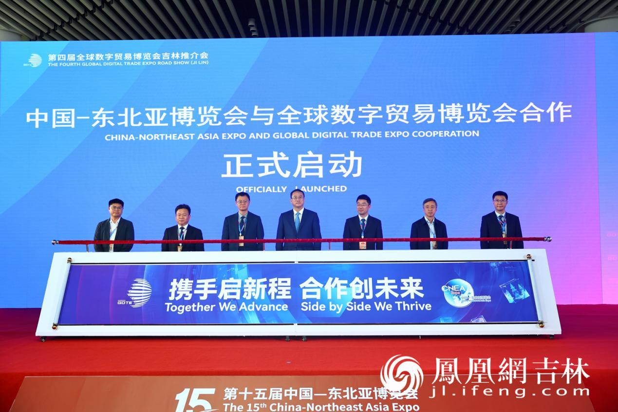 签约仪式后,杭州市委常委、副市长方毅,长春市副市长阮刚辉,商务部外贸发展事务局副局长邓波,吉林省贸促会副会长李建华,杭州市商务局局长王永芳,长春市商务局局长王欣耕,杭州市会展集团副董事长、总经理李健共同上台,启动“东北亚博览会与全球数贸会正式合作”仪式,标志着两地国家级展会平台正式开启联动发展新篇章。